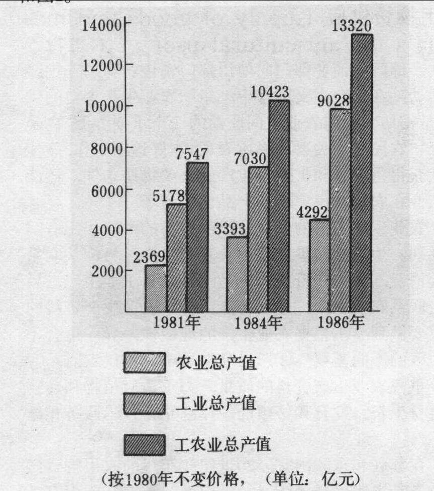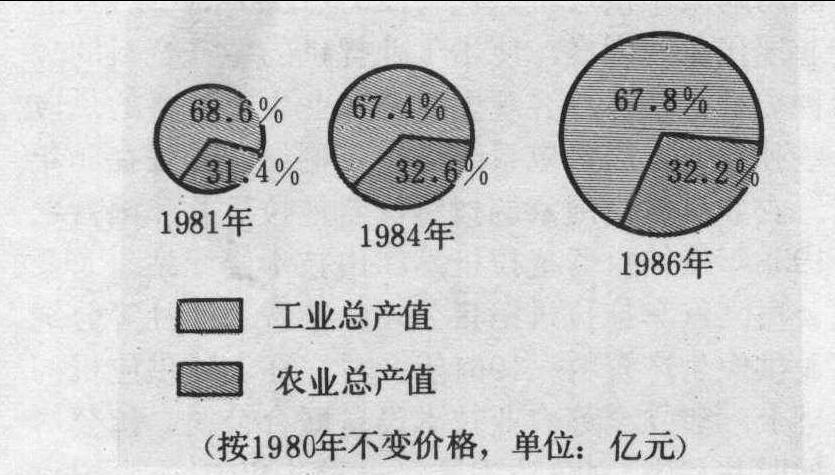 农业是国民经济的基础, 农业与工业保持相互适应的发展速度和比例是整个国民经济持续稳定、协调发展的关键。中国工农业产值结构在20世纪50年代初期为3:7,至80年代中期已变为7:3,工业在国民经济中已占绝对优势,可以对农业发展以更大的支持。1981~1986年中国工农业总产值及各自所占比例(%)如图1和图2。