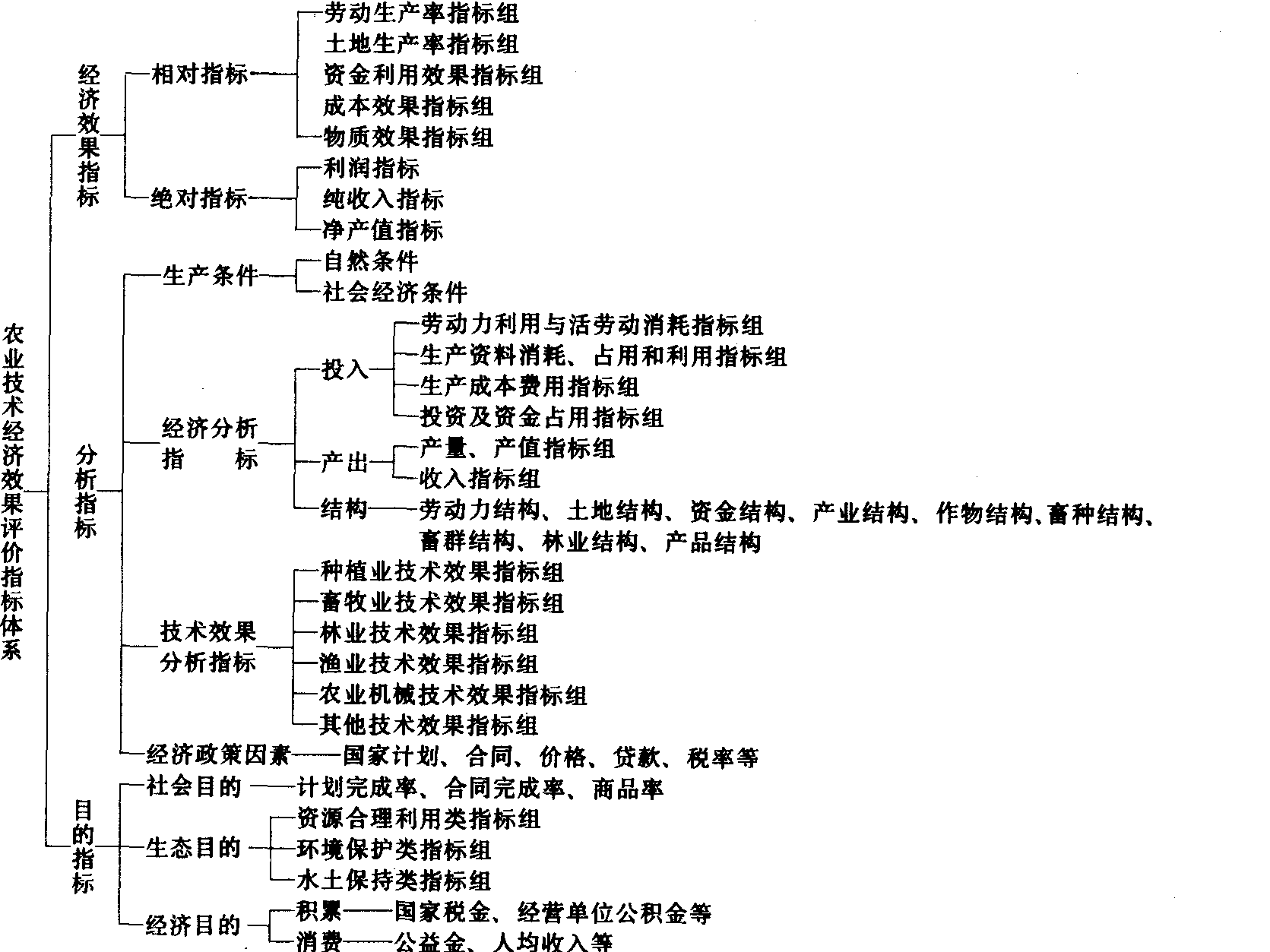 建立指标体系的必要性:❶物质生产中的经济效果难以确切计算,但却能用各种不同指标从各方面来反映它的大小。 ❷在经济评价工作中所提出的各种可能的技术方案,经常会出现用这个指标衡量表现甲方案经济效果好,用另一个指标衡量又表现乙方案好,这就要求设置若干个指标,进行全面的评价。 ❸在农业技术经济评价工作中,不仅要衡量和比较不同技术方案经济效果的大小,还要分析影响经济效果差异的因素, 测算提高经济效果对社会的贡献等。只有设置各种不同类别的指标, 才能满足经济评价工作的需要。 ❹由于农业技术经济评价牵涉的生产门类多、领域广, 因而要求按生产部门和按重大措施设置有关指标。 农业技术经济效果指标体系由三类指标构成:❶经济效果指标。由于它在指标体系中处于主要地位,又称“主体指标”,是衡量经济效果大小的尺度。它反映劳动耗费与有用效果两个方面比较的结果。经济效果指标中,有用效果与劳动耗费的关系可用除法表示,也可用减法表示。例如,劳动生产率、单位马力小时耗油量、单位产品成本、投资利润率、投资收回期、利润投资累计折算未来值比等指标,便是用除法表示的经济效果指标。纯收入、利润、净产值及净现值等指标,便是以减法表示的经济效果指标。 ❷分析指标。用以分析经济效果用的投入与产出的某一侧面的数值形式, 分别反映农业技术经济效果诸组成因素各自的作用。这类指标是通过产出或投入来影响经济效果,是影响经济效果消长变化的因素, 亦称“因素指标”。这类指标又分为生产条件指标、经济分析指标、技术效果分析指标以及经济政策因素指标。 ❸目的指标。用以反映满足社会需要程度的指标,其中包括社会效果指标、生态效果指标以及增强经营单位扩大再生产能力和提高人们生活水平方面的指标。 常用的农业技术经济效果评价指标及组成的指标体系见表。 农业技术经济效果评价指标体系target system of economic effect for agricultural technology全面评价农业技术经济效果所采用的一整套指标构成的互相联系、互相补充的体系。由于农业生产的特点和社会需要的复杂性,需要设置和运用一系列指标。这些指标不仅可以衡量经济效果的大小.而且还能揭示取得经济效果的技术条件和经济条件,为选择最佳技术措施或技术方案提供依据。农业技术经济效果评价指标体系由三大类指标构成: |