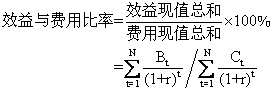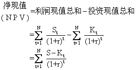 式中r1为较低的贴现率;r2为较高的贴现率;NPV1为较低贴现率的净现值(正数);NPV2为较高贴现率的净现值(负数,计算时NPV2取绝对值)。 ❹累计折算投资效果值。它是把资金进行复利计算累计到一个特定时刻的投资效果值。算式如下: 累计折算投资效果值=S/K ![]() 式中S为累计折算有用效果(如利润)未来值;K为累计折算投资未来值;P为年利率;t为开始获利年度;N为投资有效年限。 当S/K>1,即S>K时,表示此项目可行。 |