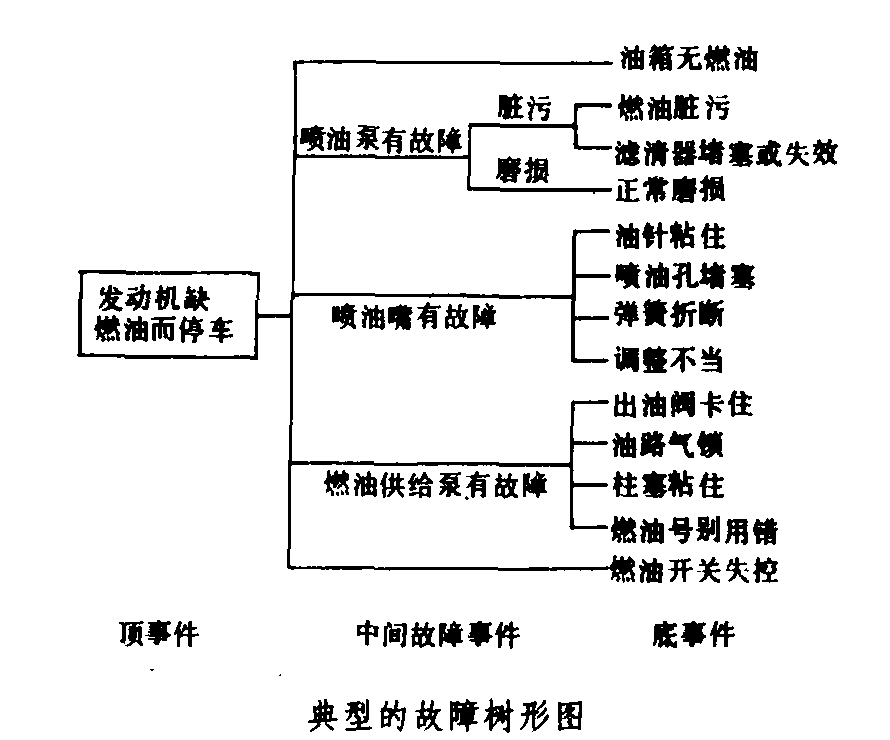 故障树法是查找故障起因的可靠性分析技术。把机器或其某个系统发生的故障状态作为逻辑分析的目标(顶事件),找出导致这一故障状态所有可能的直接因素(中间故障事件),进而找出导致这些中间故障事件所有可能发生的全部原因(底事件),用相应的代表符号和逻辑门把顶事件、中间故障事件和底事件连接成故障树形图(图),据此对系统或机器的故障进行定性和定量分析,从而对其可靠性进行评价。