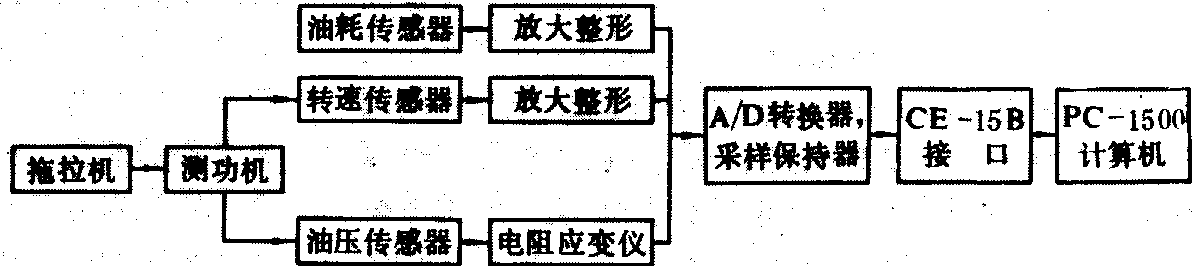 图1 犁体曲面优化设计流程框图 农机测试数据处理软件 为分析处理农业机械的测试数据而编制的计算机程序。如拖拉机功率油耗同步测量系统(图2)包括传感器、模/数(A/D)转换器和计算机等部分,可采集转速、油耗、压力等数据, 经PC-1500袖珍计算机处理后,打印输出转速、扭矩、功率、耗油量和耗油率等值,并且绘出特性曲线。