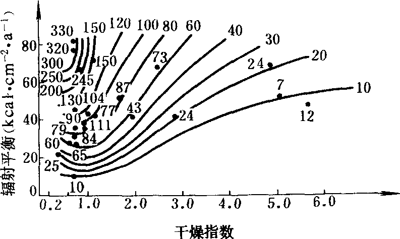 李斯模式 联合国科教文组织的《自然与资源》刊物于1972年发表了H.李斯在国际生物学计划(Inter-national Biological Programme) 支持下做的世界初级生产力模拟研究。所用的模式有两个基本回归方程, 分别表示年平均气温、年平均降水量与年干物质产量的关系, 取两个方程算得的两个产量值中较低的一个。H.李斯绘制了世界生物生产力分布图。1977年苏联H. A.叶菲莫娃根据布德柯的研究, 以辐射平衡年总量为基础所表达的热量和以干燥指数 (干燥指数=净辐射量·年降水量-1×蒸发潜热-1) 表达的湿润条件之间的关系, 估算出这些气候因子与自然植被生产力之间的定量关系(见图)。又进一步用净辐射量分布图和干燥指数分布图计算出全球自然植被初级生产力。