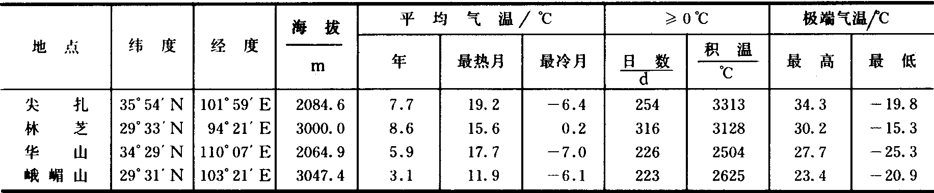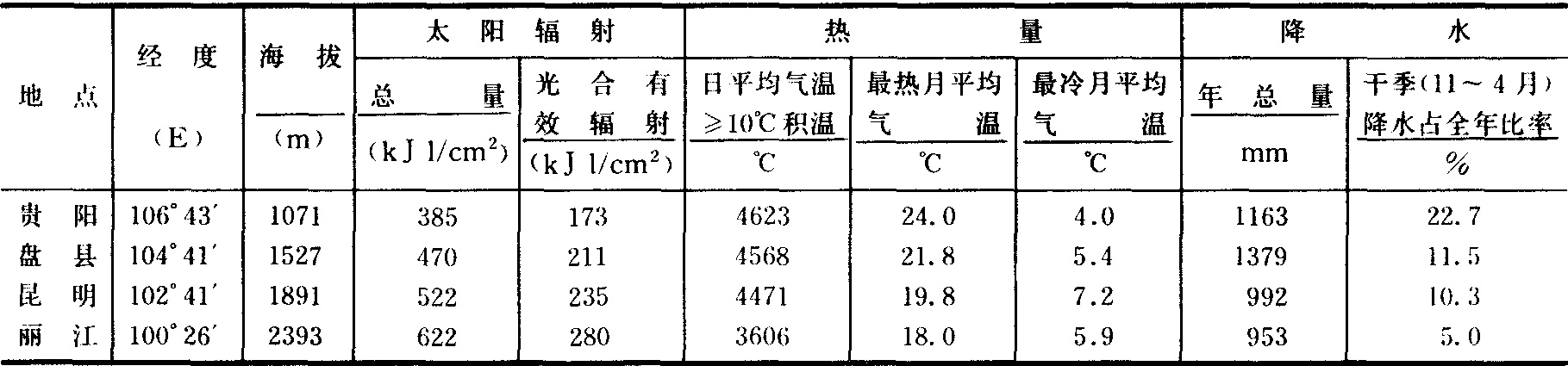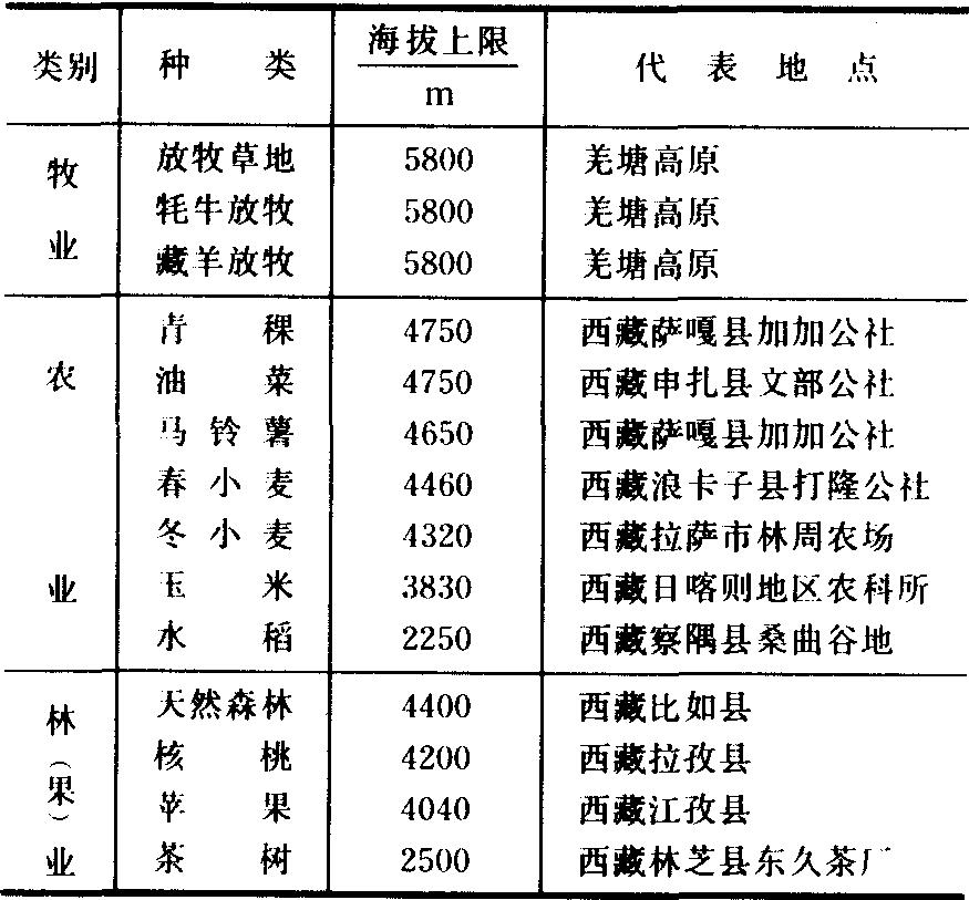 利用途径 根据地形、纬度、海拔差异分为以下几种类型: ❶高原湖盆、山间河谷盆地(平坝)和丘陵区。海拔较低, 光、热、水资源较充足, 适宜发展各种农作物。粮食作物中, 水稻居首位, 产量占粮食总产量的50%以上, 多数地区为水稻(或玉米)和冬小麦(或油菜、蚕豆等)一年两熟。广大石灰岩高原湖盆、山间河谷盆地和丘陵区, 干旱缺水, 以种植玉米、小麦、黄豆等作物为主。贵州油菜籽产量曾居全国第二位。烟草生长期内, 雨热同季, 光照和煦, 昼夜温差大,有利于干物质积累, 烟叶品质优良, 制成烤烟颜色金黄, 具有光泽, 是滇中高原湖盆区的特产。 ❷低中山区。气候温凉湿润, 适宜发展各种经济林木,油桐、乌桕、油茶、核桃是云贵高原地区传统的木本油料。其中油桐、乌桕要求温度、水分条件稍高, 适宜在东部海拔1300米以下、西部1850米以下地区发展;油茶、核桃适应范围较广,在温凉湿润、阳光充足的气候条件下结实多,出油率高,东部海拔2400米以下, 西部3000米以下适宜发展。东部海拔1400米以下, 西部2500米以下地区适宜发展生漆生产, 所产生漆质量优良。云贵高原用材林种类繁多, 有不少地方优良树种。杉木是贵州的速生树种, 海拔1800~2400米以下的地区均可发展。此外, 云贵高原盛产中药材, 天麻、贝母、当归、党参、黄连、厚朴、茯苓、红花、桔梗、木香等均适宜发展。 ❸南部西双版纳地区, 极端最低气温在0℃以上, 适宜发展三叶橡胶、咖啡、胡椒等热带作物。根据地形气候差异, 可在河谷平坝区种植水稻、甘蔗;洼地、阴坡种植咖啡; 山坡的下部暖带发展三叶橡胶、胡椒; 中、上部有灌溉条件宜种植甘蔗。由于垂直气候显著, 在农、林、牧各业布局上需注意适宜高度界限。种植业: 水稻2700米, 玉米3100米, 春小麦4000米, 青稞4100米。林业: 云南松、高山松3400米, 云杉3800米, 冷杉4200~4300米。牧业: 干旱河谷灌丛草坡2800米, 以山羊为主; 高山草甸4700米, 主要为牦牛、藏绵羊。牛分布也有明显垂直地带性: 水牛2700米, 黄牛3800米, 牦牛4700米。 (张谊光) 青藏高原 青藏高原位于中国西南部, 东起横断山区, 西抵喀喇昆仑山, 南至喜马拉雅山, 北达昆仑山、祁连山一线。面积约占国土总面积的四分之一;海拔在4000米以上, 素有“世界屋脊”之称。 农业气候资源特点 ❶光热资源。一方面光资源丰富。大部地区年总辐射量为502~753千焦/厘米2。西南部达753~837千焦/厘米2, 为中国太阳辐射的高值区。作物生长季光合有效辐射188~293千焦/厘米2。太阳辐射强, 日照百分率高, 有利于发展农、林、牧业; 另一方面与中国东部同纬度低海拔地区比较, 由于地势高, 全年无夏, 冬季漫长, 热资源不足, 只适宜种植喜凉作物和牧草。但尖扎、林芝与同纬度高度也相近的东部的华山(陕西)、峨嵋山(四川)比较, 不仅平均气温和极端最高气温高,而且日平均气温≥0℃日数和积温也高(表2)。因此, 尖扎、林芝是高原上的主要粮食作物产区。而华山, 峨嵋山则只能种植生长期很短的小油菜、小白菜等。 ❷水资源。青藏高原东部及东南部边缘地区, 年降水量由400~600毫米增加到1000~1500毫米, 有大面积草甸草原和森林; 西半部年降水量由150毫米左右降至30毫米以下, 为大面积高寒草原、高寒半荒漠和荒漠。高山地区广泛分布着现代冰川和永久积雪, 夏季冰雪消融, 是山麓地带牧场和农田灌溉的主要水源。 ❸气候类型复杂。青藏高原南北约跨15个纬度, 地势高差悬殊, 从东南部河谷到“世界屋脊”顶部的气候变化, 依次有亚热带、高原温带、高原寒带, 水平变化和垂直变化交错, 干湿状况亦有湿润、半湿润、半干旱、干旱等差别。 表2 尖扎、林芝和华山、峨嵋山热量条件比较 ![]() 利用途径 ❶北部区, 适宜发展畜牧业生产。东北部, 气候寒冷湿润, 以禾本科和莎草科喜凉牧草为主, 草质优良, 粗蛋白质含量高, 粗纤维含量低, 适口性强, 适宜发展具有高原特色的牦牛和藏绵羊等;西北部, 气候严寒、干旱, 风大,植被为高寒草原、高寒半荒漠和荒漠, 适宜发展藏绵羊和山羊等。 ❷高原河谷、湖盆区, 光、热、水条件好, 是青藏高原主要农耕区,占总耕地面积的80%。适宜发展青稞、小麦、油菜、马铃薯等喜凉作物, 各种作物种植高度和放牧的上限见表3。此外,还可发展在高原特殊气候条件下生长的珍贵药材, 如冬虫夏草、藏红花、麝香等。目前,西藏作物生长期的光能利用率不到1%,还有很大生产潜力。 ❸横断山脉峡谷区, 海拔在3000米以上, 有的高山超过4000~5000米, 谷底与山岭之间相对高度达2000米以上,气候垂直变化明显。这里蕴藏着大片的原始森林,以云杉、冷杉为主的高山暗针叶林,一直延续到藏东南和藏东北。且其林木生长速度快,木材蓄积量高,病腐率低。察隅地区树龄2000年的云杉,树高达80米,直径2.5米,单株材积量达40立方米,分布上限4400米。林线以上为天然牧场。宜以发展林业为主,林、牧并重(见彩图92—96)。 表3 青藏高原牧、农、林业等分布上限