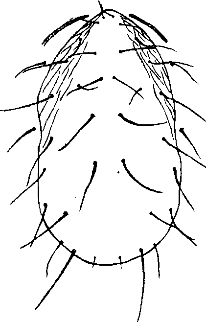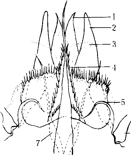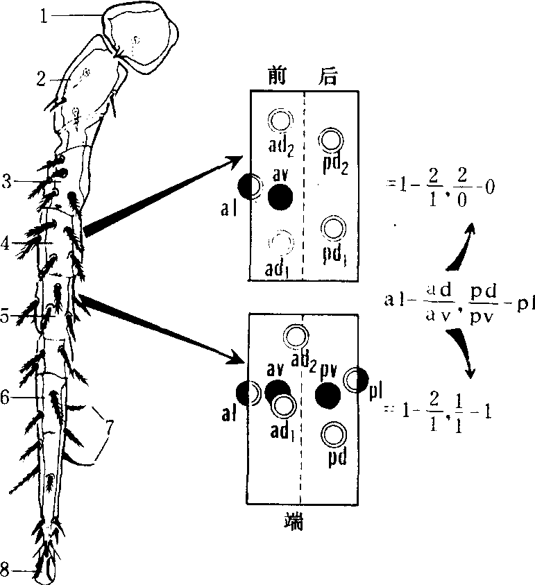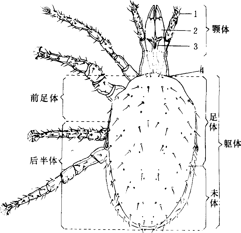 颚体 是螨类外部形态中最复杂的部分,多数种类位于躯体前端。一般与昆虫头部相似,但只有口器,脑及眼均不在颚体。脑位于颚体后方的躯体中,如有眼,则位于前足体的背方或背侧方(图2)。 颚体基部具有螯肢(chelicera)一对、须肢(pedi-palp)一对及口下板(hypostoma)一块。背面有一块头盖(tectum)或称口上板(epistoma)。 螯肢由3节构成,即基节与分成二部分的端节,而大部分螨类端节成为螯钳(che-la),其背侧称为定趾(fixed digit),而腹侧称为动趾(movabledigit)。通常在定趾与动趾上有齿。 须肢一对位于螯肢后方或外方,形成颚体的侧腹部,为感觉器官,具有趋触毛,用以寻找食物。须肢形状、节数、各节刚毛数、形状及排列等因种类而不同。一般分为6个或5个可动的节,即:转节(trochanter)、股节(femur)、膝节(genu)、胫节(tibia)、跗节(tarsus)及趾节(ap-otelus)。但趾节常退化,残存为爪或毛。