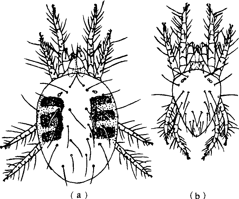 表4 农业螨类的重要科 寄螨目 革螨亚目 寄螨科Parasitidae、囊螨科 Ascidae、 植绥螨科Phytoseiidae、蛾螨科Otopheidomenidae、 巨整螨科Macrochelidae、厉螨科Laelapidae、 喘螨科Halarachnidae、皮刺螨科Dermanyssidae、 瓦螨科Vorroidae 真螨目 辐螨亚目 真足螨科Eupodidae、莓螨科Rhagidiidae、 叶爪螨科Penthaleidae、镰螯螨科Tydeidae、 吸螨科Bdellidae、巨须螨科Cunaxidae、 蒲螨科Pyemotidae、跗线螨科Tarsonemidae、 长须螨科Stigmaeidae、肉食螨科Cheyletidae、 蠕形螨科Demodicidae、叶螨科Tetranychidae、 细须螨科Tenuipalpidae、瘿螨科Eriophyidae、 大赤螨科Anystidae、赤螨科Erythraeidae、 绒螨科Trombidiidae、竞螨科Unionicolidae 粉螨亚目 粉螨科Acaridae、嗜甜螨科Glycyphagidae、 果螨科Carpoglyphidae、食菌螨科Anoetidae、 半疥螨科Hemisarcoptidae、麦食螨科Pyroglyphidae、 痒螨科Psoroptidae、羽螨科Analgidae、 疥螨科Sarcootidae 甲螨亚目 前翼甲螨科Pelopidae、若甲螨科Oribatuloidae 经济意义 对农业为害最严重的是叶螨科,其次是瘿螨科,后者还能传播植物病毒病。而植绥螨科是最重要的益螨,它捕食害螨,在生物防治上极有价值。 全世界叶螨种类约达900种以上,中国已知110种以上,其中最重要的有:❶二斑叶螨(Tetranychu surticae)主要为害棉花,并寄生于所有的显花植物,寄主在全世界已达150种以上(图4); ❷朱砂叶螨(Tetr-anychus cinnabarinus)主要为害棉花等各种经济作物、杂草以及观赏植物; 中国为害棉花等最严重的叶螨是朱砂叶螨,俗称棉红蜘蛛。 ❸山楂叶螨(Tetranychusviennensis)为害苹果、梨、桃、山楂等和多种蔷薇科观赏植物; ❹苜蓿苔螨(Bryobia praetiosa)俗称苜蓿红蜘蛛,为害苜蓿及多种杂草; ❺麦岩螨(Petrobialatens)俗称麦长腿蜘蛛,为害小麦、大麦、大豆、棉花,桑以及多种杂草; ❻苹果全爪螨(Panonychusulmi)俗称苹果红蜘蛛,为害苹果、梨、桃等多种果树,与柑橘全爪螨同为中国最重要的果树害螨; ❼柑橘全爪螨(Panonychus citri)俗称柑橘红蜘蛛,主要为害柑橘类。