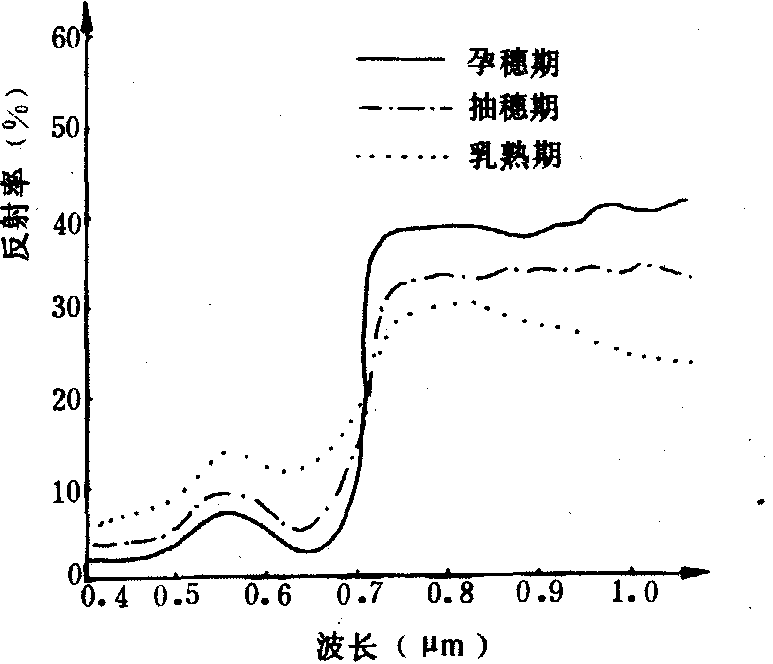 图2 不同种类的农作物反射光谱曲线 同一种农作物在不同生长时期,其反射波谱有较大的差异。某一农作物在它整个生育期内,由于叶绿素含量在不断变化,0.45微米和0.65微米左右的反射率也随之发生变化;叶片内部结构和叶面积指数的变化,使近红外谱段的反射率发生相应的变化。图3是水稻各个生长期的反射波谱曲线。掌握农作物不同生长期的波谱特性,可用于选择不同时相的遥感资料来识别不同种类的农作物。如8月份的棉花与晚熟品种的水稻在红谱段和近红外谱段的反射波谱就有很大的差别。在多谱段彩色合成的图像上,根据其颜色的深浅,可以区分出这两种农作物。