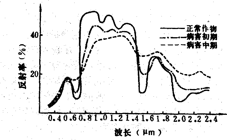 图3 水稻不同生长期的反射波谱曲线 养分、水分和病虫害对作物波谱的影响 农作物在缺少某种养分时,会影响叶片的颜色、水分含量和叶际结构,使得可见光谱段反射率增大,而近红外谱段的反射率减小;农作物随着缺氧症状的加重,可见光谱段的反射率增大;农作物在受到病、虫的侵害后,光合作用的能力降低,使叶绿素含量减少,可见光谱段,特别是0.65微米左右的红谱段的反射率上升。病虫侵害使得叶片的栅状组织和海绵状叶肉开始衰萎,水分减少,近红外谱段的反射率降低,在1.45和1.95微米波长水分强吸收处,随病症的加重而逐渐消失。将生长正常(健康)的农作物同病症初期(人眼还不能明显察觉)的农作物的反射波谱曲线进行比较(见图4),可以早期地发现它的病害或营养状况。 农作物反射波谱的测定 农作物反射波谱测定是指用光电探测仪器定量获得农作物按波长分布的反射率数据。通过对不同农作物的光谱测定、对同一种农作物不同生长季节或不同生长条件下的光谱测定,了解其各自的特征,这对设计遥感器、农作物遥感最佳波段的选择、多谱段图像假彩色合成、各种农作物遥感最佳时期的选择、影像分析和图像解译中对农作物的判读、识别、分类都有重要的意义。早在1965年,盖茨(D.M.Gates)等人已详细地在实验室测定了植物的反射、透射和吸收的光谱曲线及叶片在不同时期的反射波谱以及岩石、土壤、水体的反射波谱。依据地物波谱的各自特征,确定了美国陆地卫星-Ⅰ号(Landsat-Ⅰ)多谱段扫描仪(MSS)的工作波段。随着野外光谱辐射计的研制,农作物的反射波谱测定工作由室内转到室外,如美国、日本在20世纪70年代获得了各种农作物地面的反射波谱数据。中国的第一次实地光谱测定工作是1978~1979年在云南省腾冲地区进行的,当时获得了部分农作物的反射波谱曲线。随后,从事遥感工作的教学和科研单位分别对中国小麦、水稻、玉米、大豆、棉花等主要农作物做了专门的地面反射波谱测定,并运用它们的波谱特征与其生物量、产量之间建立了数学模型,用作农作物的长势监测和产量估测。