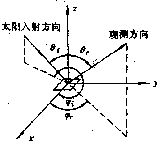 图5 叶片反射率、透射率和吸收率的关系 为了使实验室测量光谱更加符合实际情况,一些国家建立了大型的模拟实验室。中国科学院长春光学精密机械研究所也建了这样的实验室,其光源为人造太阳。这种大型模拟实验室特别适合研究农作物光谱的规律性,如反射光谱的角分布;各种因素(营养状况、不同生育期、病虫害、含水量和入射光的角度、光强度变化等)对反射光谱的影响。实验室光谱工作的另一个目的是选择地物最佳遥感波段,0.40~1.10微米是农业遥感的最佳波段。 实验室光谱工作决不能代替野外的光谱工作。野外光谱测定获得的是农作物群体对光的综合响应,并包含了农作物周围自然景观的影响,它与航空、航天遥感技术中摄影、扫描所获得的地面信息有很好的内在联系,其光谱数据更具有实用价值。 野外光谱工作中使用的光谱辐射计可分为两大类:一类是连续扫描型,它可以连续地测量所需要的波长范围内的光谱反射率;另一类是非连续型,通常用几块干涉滤光片,可将每块滤光片分别制成透过某一波长区域内的光与陆地卫星多谱段扫描仪(MSS)的四个工作谱段相一致,或与专题成像仪(TM)的各个工作谱段相一致。这样,读出的光谱反射率可以与陆地卫星上多谱段扫描仪或专题成像仪等仪器获得的数据进行相互比较。 农作物的冠层对光的反射并非镜面反射(符合反射定律的反射),也非理想的漫反射(反射光强均匀地分布整个空间),而是介于两者之间有一定角分布的反射。野外光谱测定时,光谱辐射仪接收的是某一立体角内农作物的反射能量。农作物对光反射的角分布除受农作物本身的冠层状态影响外,太阳的高度角(即入射光的角度)的变化也对它有一定的影响。所以,野外光谱测定常用方向反射因子(或称双向反射因子)来描述农作物反射光谱的空间分布。仪器测量的方向反射因子与入射光的天顶角θi、方位角φi,反射光的天顶角θr、方位角φr四个参数有关(见图6)。
