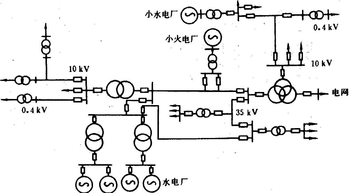 图2 无备用农村电力网接线示意 在以小电站供电为主的地区,许多小电站并联运行,主网架采用环形或双端电源干线式的有备用接线方式,一般在最高电压级的主网内与国家电力系统并网运行,给用户供电的配电网络仍用无备干线式接线方式。当线路中有小电站并入电网运行时,采用双端电源供电方式。 稳态电气计算 包括功率(潮流)分布计算、电压计算、功率及电能损耗计算(见农村电力网潮流计算、农村电力网电压调整)和导线截面选择计算(见导体截面选择)。 农村送配电线路供电半径 在一定传送容量或负荷分布情况下,满足技术经济条件的最大送电距离。供电半径决定农村变电站、配电变压器的合理布局。❶35千伏农村架空送电线路供电半径。按经济电流密度选择导线截面,并使线路电压损耗不超过10%,得到的供电半径计算公式为: