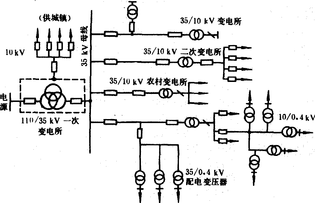 图1 有备用农村电力网接线示意 接线方式 农村用户对供电可靠性的要求低于城市、工业及矿区用户,目前中国农村电力网的接线方式以无备用接线方式为主。在由国家电力系统供电的地区,为农村供电的110千伏线路,根据技术经济比较确定采用有备用接线方式(图1),或无备用接线方式(图2)。35千伏系统一般采用无备用接线方式,有的地区采用环形有备用接线方式,开环运行。6~10千伏配电线路一般采用无备用接线方式,主要是有分支线的干线式。