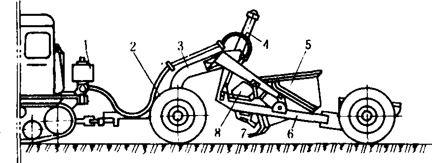 牵引式铲运机 1. 液压操纵装置;2. 车轮; 3. 辕架; 4. 油缸; 5.铲斗; 6. 机架; 7. 铲刀; 8. 前斗门 时关闭前斗门,运至卸土地点。卸土时,在升降油缸的作用下,使辕架靠近机架的同时通过联动杆件使铲斗提升,向前倾翻至铲斗底部与地面成50°~60°,土方靠自重从斗门和铲斗之间的开口卸出。牵引式铲运机的机重与铲斗容量不受拖拉机悬挂装置限制,铲斗容量较大,效率较高,作业稳定性能好,适于土方量较大的工程,使用广泛,但铲装阻力峰值较大,多与履带拖拉机配套使用。牵引升运式铲运机 由牵引架、前后行走轮、辕架、升运装置、铲斗、传动系统及液压操纵系统组成。作业时,拖拉机利用空行程,用铲运机后部配置的松土齿将土层松动。铲装时,铲斗在升降油缸的作用下降落到所要求的铲土深度,其铲刀铲起的土壤在升运链板的带动下有层次地升运到铲斗中,装满土壤后再提起铲斗,转入运输状态。同时切离拖拉机动力输出轴的动力,升运装置停止工作。将土方运至卸土地点后,操纵控制铲斗活动底板和铲斗后推土板的液压油缸动作,使铲斗活动底板向后拉开的同时,铲斗的后推土板向前推土。土方连续被强制从下部排出,卸完土后再使活动底板和后推土板恢复原位,呈空行状态。牵引升运式铲运机采用“分阻增容”原理,即利用铲前松土和升运器分层入斗的措施,分散和削减铲装阻力峰值,在与相同的拖拉机配套时,升运式铲运机比普通铲运机有较大的铲斗容量,其牵引力利用系数和发动机功率利用系数均有显著提高,因而生产效率高。其缺点是结构复杂,造价高,机动性较差。 农用铲运机的主要工作部件是铲斗。它有两种组合形式。一是整体式铲斗,呈簸箕形状,多用在为22千瓦以下的小型拖拉机配套的铲运机上;二是组合式铲斗,因前卸土与后卸土的类型而其结构形式有所不同。前者只有前斗门,在铲、装土和卸土时开启,运土时关闭;后者装有铰接的前、后斗门,铲、装土时前斗门开启,卸土时后斗门开启,运土时前、后斗门均关闭。铲斗横断面多为矩形或梯形,铲斗底面与水平面的倾角,在铲装时一般为0°~7°,而在倾翻卸土时,常大于50°~65°,土质粘重时取大值。铲刀通常由若干个铲刀片,并排装在铲斗的前下方组成,铲土时铲刀面与水平面的夹角称为切土角,一般为25°~45°,常用值为30°~35°;最大铲土深度:牵引式一般为15~20厘米;悬挂式为7~10厘米。 铲斗容量与铲土幅宽取决于配套拖拉机的功率(或牵引力),一般与22千瓦左右轮式拖拉机配套的农用铲运机,铲斗容量为0.5~0.7米3,幅宽为1.2~1.5米;与40千瓦轮式拖拉机配套的,铲斗容量为1米3,幅宽为1.8米;与55千瓦履带拖拉机配套的牵引式铲运机,铲斗容量为2~2.5米3,幅宽为1.8~2米,而升运式铲运机铲斗容量为5米3。 有的铲运机采用活动底板的铲斗,通过液压操纵系统控制的专用卸土油缸,使活动底板后移和推板前推,实现强制卸土,与倾翻铲斗的卸土方式相比,卸土干净,卸土表面平整,便于后续作业进行。 |