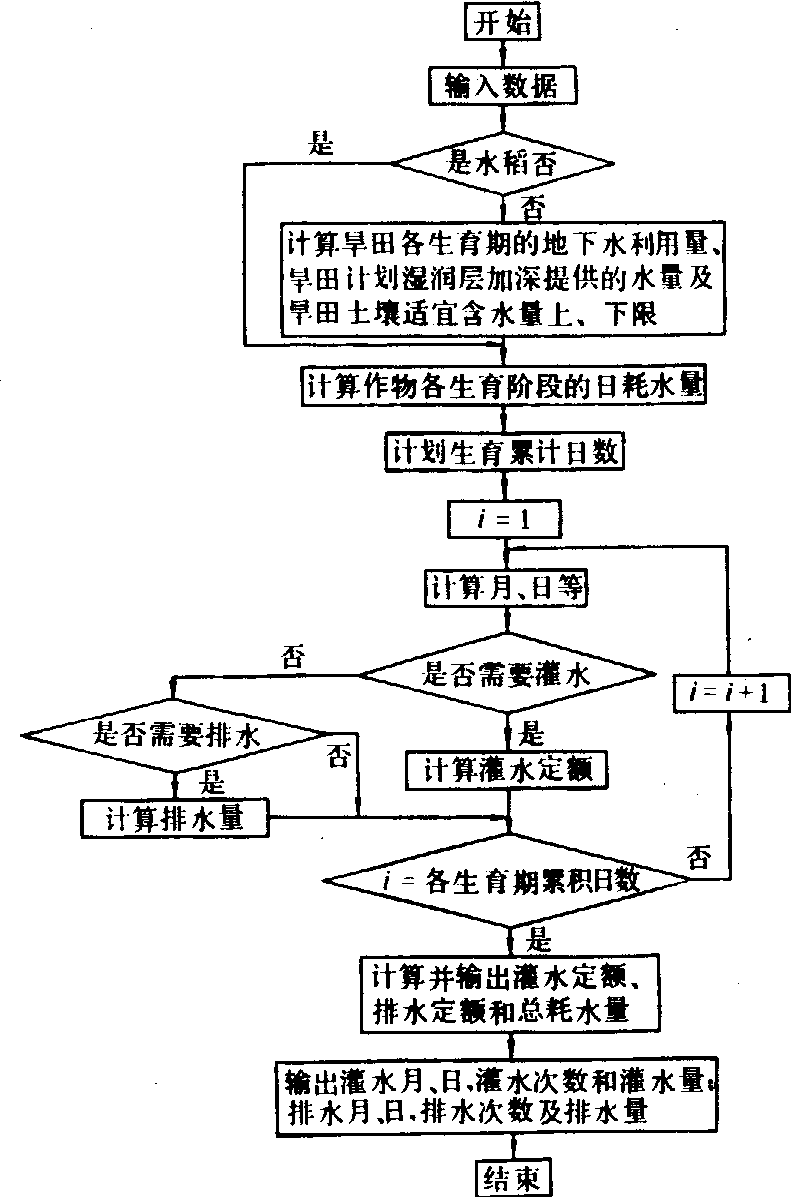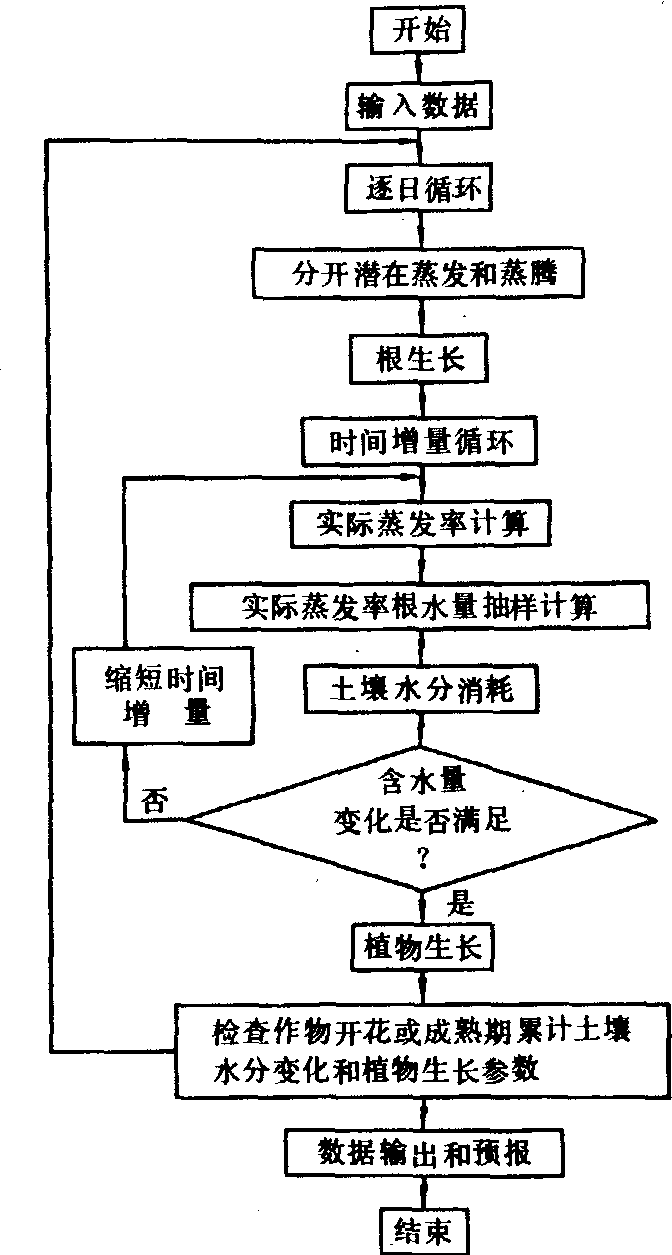 图3 灌溉作物生长的仿真模型软件的流程图 20世纪80年代以来,随着微型计算机的普遍使用,用各种高级程序设计语言编写的农田水利应用软件相当丰富,可供用户自由选用。 |
