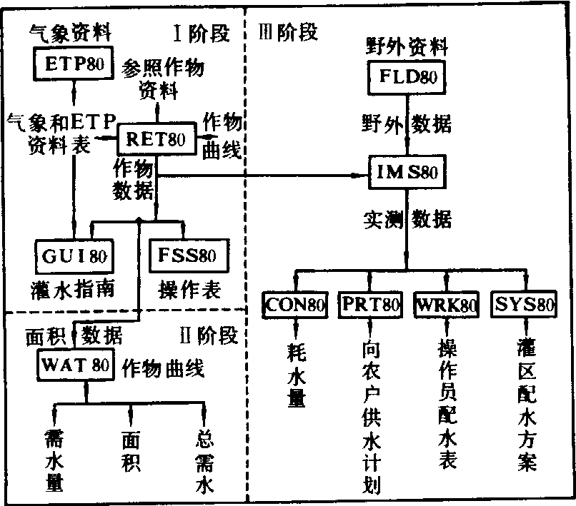 图1 作物生育期灌溉制度的计算流程框图 农田水利单项综合性软件 灌排工程规划设计和运行管理的优化软件是采用系统分析方法设计而编制的程序。它能建立最优化的数学模型,然后选用线性规划、非线性规划或动态规划等算法,求解数学模型输出结果。属于这类软件还有: ❶用于中国北方灌区的地面水和地下水优化调度的计算机软件。可根据灌区的条件和要求,确定灌区增产效益最大的配水方案; ❷用于南方圩区的除涝排水系统优化规划的计算机软件。在满足各种约束条件(如水量平衡约束、最小河网水面率约束等)的前提下,确定截流沟、湖泊、河网、抽排站和排水闸等排水工程的最优布局和规模,以达到总投资最小的目的。 农田水利专项软件包 在灌区运行管理中,用水计划软件包是一个功能齐全的综合性软件包,包括11个独立的功能模块:❶ETP 80程序按Jensen和Penman公式,根据气象因子计算蒸发力ETP; ❷RET80程序根据ETP值求参照作物的腾发值ET; ❸FSS80程序编制参照作物田间腾发值ET的表; ❹GUI80程序根据ET表列出参照作物的灌水指南; ❺WAT80程序按作物种植比例计算需水量,输出需水量结果; ❻FLD80程序安排灌水先后顺序表; ❼IMS80程序按田地分析土壤水分消耗,预测灌水日期,编制配水表; ❽PRT80程序提出农户灌水方案; ❾WRK80程序编写田间操作员灌水图表; ❿SYS80程序按农渠和斗渠编制配水计划;(11)CON80程序按农渠和斗渠编制耗水情况表。该软件包主要模块的结构框图,如图2所示。
