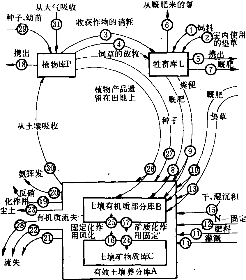 农田生态系统养分循环模式图 调控 对农田生态系统的调控途径有: ❶合理组建农田生物群落。采用复合群体结构或复种轮作方式,以充分利用热量资源、土壤营养和农田空间,使作物群落截获更多的日光能,并充分发挥生物间互补互利作用,减少病虫杂草为害,增强群落对环境的适应性和对不利因素的耐性,提高系统的生产力及其稳定性。 ❷选用具有高光效和具有不同适应性的作物品种,提高农田生物群落的光合效率。并运用生物激素技术调节同化物的分配、转移、贮藏以获得较高的经济产量。 ❸采用合理的农田土壤管理技术。根据种植制度、土壤特性和当地自然条件,制定合理的农田耕作、施肥、排灌、除草等土壤管理技术,为作物创造稳定和适宜的环境。 ❹处理好农田生态系统与其他生态系统之间的关系。按照农业生态学原理,协调种植业、养殖业、林业、沼气、食用菌、农产品加工等各业之间的关系,以提高农业生态系统的总体功能,从而促进农田生态系统自身的发展。 农田生态系统farmland ecosystem以作物为中心的农田中,生物群落与其生态环境间在能量和物质交换及其相互作用上所构成的一种生态系统。农业生态系统中的一个主要亚系统。与陆地自然生态系统的主要区别是:系统中的生物群落结构较简单,优势群落往往只有一种或数种作物;伴生生物为杂草、昆虫、土壤微生物、鼠、鸟及少量其他小动物;大部经济产品随收获而移出系统,留给残渣食物链的较少;养分循环主要靠系统外投入而保持平衡。农田生态系统的稳定有赖于一系列耕作栽培措施的人工养地,在相似的自然条件下,土地生产力远高于自然生态系统。 |