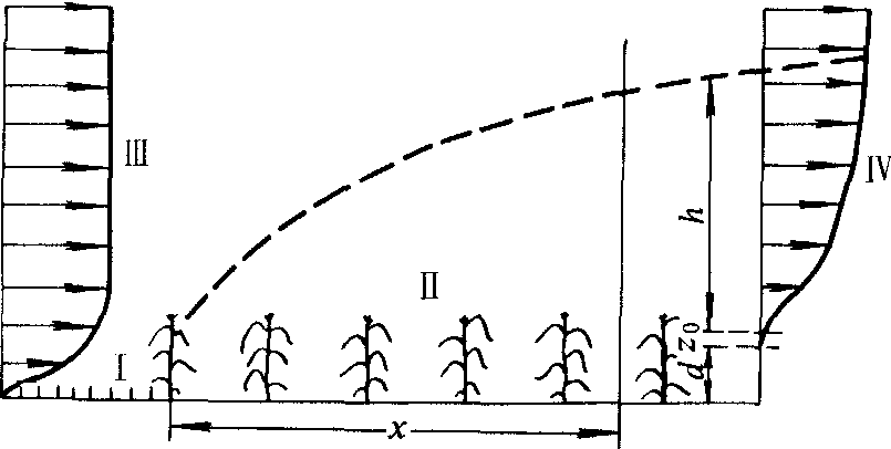 玉米地边界层示意图Ⅰ.矮秆作物: Ⅱ.玉米地; Ⅲ、Ⅳ.风速廓线: Zo.粗糙高度;d.零平面位移高度;h.农田边界层高度;χ.离玉米地边的距离 另外,由于叶片同空气摩擦而产生的粘滞切应力,也使叶片表面形成了一个空气边界层,即叶面边界层。1963年D.M. 盖茨等应用司列伦照像(Schlierenphotograph)揭示各种叶面附近的空气对流现象;1970年矢吹等也借司列伦照像进行了叶面边界层的分析。根据他们对甘蔗叶面边界层的司列伦照像,发现从前缘开始,顺着风向叶面边界层逐渐变厚,但随风速的增大而变薄。由于CO2或水汽分子的输送, 都要穿过这一边界层, 所以, 该层的厚度影响极大, 而且边界层内的气流, 到底是乱流还是片流,也是重要的问题。这两个问题彼此都是互相关联的。 农田边界层boundary layer over a field受来自农田边界面切应力所影响的气层。在矮秆作物地段,由于风速大约在2 m高度才开始减低,并随高度变化,因而显示出一个相对低的内边界层。而在高秆作物的玉米地上,充分发展的农田边界层可达到相当高度。边界层的高度h是离这块地的前缘距离x的函数(通常h=0.75x0.8)。农田边界层,不仅决定于作物种类,并随作物生育状况而变化。所形成的农田微气候特点,同作物地特性直接相关。只有在农田边界层中的微气候特点,才是真正由这块农田所形成的。这一点对研究农田微气候,有重要的理论意义。农田中的孢子、花粉和许多无机微粒的运动,也受到农田边界层内气流结构的影响。当微粒处于片流区内,它们或飘浮在空中或作层流运动;一旦进入乱流区,即朝不同方向飞溅,甚至达到相当大的高度。
