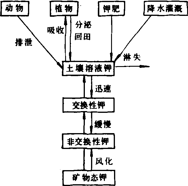 | 释义 | 农田钾素循环potassium cycling in agricultural land钾素在生物体和土壤之间往复传输过程。由各种途径进入土壤中的钾将参与土壤中各种形态钾之间的动态平衡;同时,部分钾素又进入生物体或以其他途径离开土壤。从土壤移去的钾素中又有部分钾将重新进入农田钾素循环之中,使农田钾素的循环永恒地进行。其全过程如图所示。