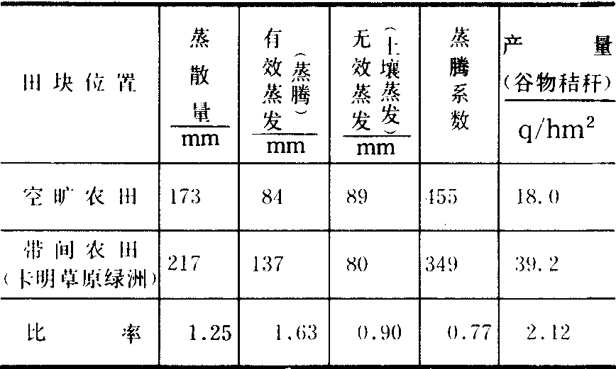蒸散 由蒸发器测得林带附近的蒸发能力比无林带保护的农田明显减小, 中国北方各防护林区的观测结果表明, 网格内的蒸发能力平均约降低10%~25%,最小值与风速最低值出现的位置相一致, 当风速大、湿度小时,在5H处甚至可减少40%以上。林带影响蒸发能力的范围和影响风速的范围相一致。苏联的观测结果表明,林网内平均蒸发能力比旷野减低10%~20%。林带防护下的农田实际蒸散量与蒸发能力并不一致。林网内土壤较湿润, 总蒸散量有时反而较旷野高。表2是康斯坦丁诺夫的观测结果, 带内农田蒸散量为空旷农田的125%, 蒸腾量为163%, 土壤蒸发为90%。林网内的农田不仅降低了无效蒸发(土壤蒸发), 蒸腾系数也降低了23%, 他认为这种降低是农业森林土壤改良综合措施的结果。一般林带可使蒸腾系数降低15%左右。