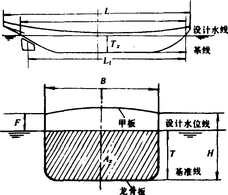 农船的主要尺度 船型系数 用以表征船体水下部分的形状特征。主要有:❶方形系数δ,又称为排水量系数,为设计水线下船体体积V与矩形体体积Ls×B×T的比值。若δ接近1,则船的水下形状为矩形体;若δ接近0.5,则船的水下形状为三棱柱体。一般取δ=0.56~0.658。 ❷船舯剖面系数β,为船长中点处设计水线下横剖面面积Ax与矩形面积B×T的比值。一般取β=0.83~0.92。 ❸设计水线面系数α,为设计水线面面积Ax与矩形面积Ls×B的比值。α值的大小反映设计水线面的大小程度。一般取α=0.79~0.88。 ❹棱形系数ψ,为设计水线下船体体积V与棱柱体体积Ax×Ls的比值。ψ值大小反映农船水下形状沿船长方向变化的情况。ψ值大表示沿船长变化小,水阻力大;ψ值小则表示船体中部饱满而两端狭小,水阻力小。一般取ψ=0.62~0.73。 尺度比 即农船主要尺度L、B、H、T之间的比值。它在一定程度上反映农船的航行和使用性能。❶L/B值大,一般是航速较快的特征。内河农船由于吃水受到限制,为获得较大稳定性,船的宽度较大,而L/B取较小值。一般为3.52~5.02。 ❷L/H值大则船体呈狭长扁平状,纵向强度较差。 ❸H/T值大则干舷大,船的抗沉性较好。 ❹B/T值大则稳定性好,但阻力相应增大。一般取B/T=3.14~4.33。 ❺L/T值小则操纵性较好。 排水量和载重量 农船的排水量是指船体浮在水中时排开水的重量,即农船的全部重量。包括船体、农船设备、舾装、机电设备等不变重量,以及货物、船员、燃料、日常生活供应品等可变重量。由于农船装载情况不同,排水量分为轻载和满载两类。 农船在设计吃水时的满载排水量可由下式求得: