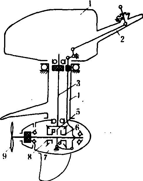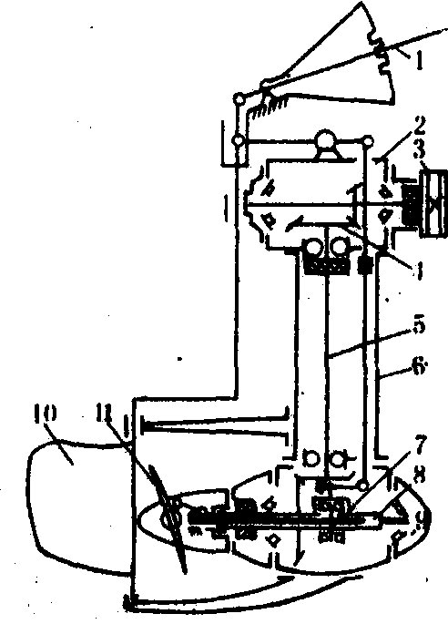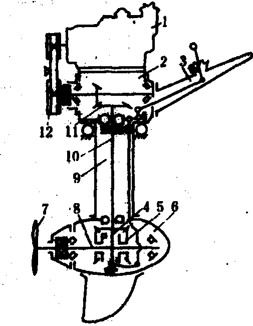 图3 手动式可变螺距挂桨示意图 1.操纵手柄; 2.上箱体; 3.胶带轮;4.圆锥齿轮; 5.中间轴; 6.中间轴管;7.变距杆; 8.桨轴; 9.下箱体; 10.舵; 11.螺旋桨