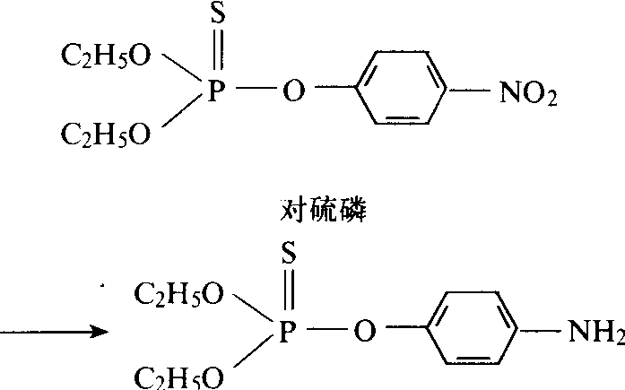 还原反应 由还原酶催化的初级代谢。能催化农药发生还原反应的酶种类有限,硝基还原酶(nitroreductase)即属这一类。还原反应在农药的初级代谢中远不如氧化反应和水解反应重要。还原反应通常包括硝基还原为氨基的反应,氢化反应及脱卤反应。如含有硝基苯母核的农药苯硫磷、对硫磷、杀螟硫磷等在反刍动物的胃液中很容易还原为氨基衍生物。当有机磷农药分子中的硝基被还原为氨基后,它们就失去了原有的生物活性与毒性。有机氯农药在动物体内还原脱卤后,一般还须经历羟基化反应、轭合反应等过程后才能从尿中排出。农药还原反应实例如下: