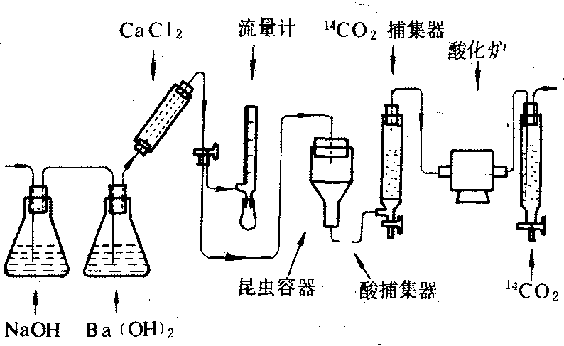 图2 昆虫代谢研究用14CO2和挥发性化合物捕集装置 样本提取和纯化 在提取样本时,应选择合适的有机溶剂作为提取剂。通常作为提取剂的有机溶剂有正己烷、丙酮、甲醇、乙腈等,也可以用混合溶剂进行提取。由于在提取过程中,有些杂质(样本自身所含的一些物质)有可能与农药分子及其代谢产物一起溶入提取剂中,其中有些组分可能会对代谢产物的鉴定产生干扰,因此须对提取液进行纯化处理,尽可能地除去干扰杂质。常用的纯化方法有液液分配法、柱层析法、薄层层析法等。提取液中如果代谢物含量甚微,有时可能被杂质吸附而不能被提取,有些代谢物也可能在提取或纯化过程中发生分解,为防止上述情况的发生,样本的提取与纯化过程应在低温下进行,并作添加回收率试验。提取过程中,样本中能溶于提取剂中的农药母体化合物和代谢物称之为可萃取物质,需对这些可萃取物质所包含的成分进行定性与定量分析。不能溶于提取剂的称之为不可萃取物质,即通常所说的结合残留。 代谢物分离和鉴定 在提取过程中,溶于提取剂中的物质往往是多组分混合物,鉴定前须使各组分分离,其方法有:❶薄层层析法是最常用的分离手段,展开后的薄板,采用喷涂发色试剂、放射性自显影等方法与标准品斑点相比较,即可达到定性分析的目的。若须对斑点上的化合物定量测定,可刮下薄板上相应部位的硅胶并溶于适当的有机溶剂中,再用仪器测定。 ❷全自动放射性薄层扫描仪法是近年出现的新方法,可对展开后的薄板上各放射性斑点直接扫描画出色谱图,并由计算机系统算出色谱图中各个峰的Rf值(定性依据)及峰面积(定量依据)。 ❸用气相色谱法或高压液相色谱法对代谢物进行定性和定量分析。上述定性与定量方法的一个前提是必须有标准品作为对照。在没有标准品的情况下可将代谢物用柱层析或制备薄层层析法反复分离精制,然后用质谱法、红外光谱法、核磁共振谱法等方法确定化学结构。 水溶性代谢物中的轭合物是由农药母体化合物或代谢物和生物体内某些轭合剂结合形成的大分子物质(见轭合残留)。为了弄清它们的结构,通常先用酶或用酸、碱使轭合物水解,继之用薄层层析法分离水解产物,再用上述方法进行定性与定量测定。 不溶于提取剂的结合残留只能用放射性同位素示踪法测定,即用氧化燃烧法把结合残留中所含的14C转变成14CO23H转变成3H2O。生成的14CO2和3H2O分别被仪器自动捕集后,用液体闪烁计数器测定其放射性活度。氧化燃烧法只能对不可萃取的结合残留中所含的放射性物质定量测定,而不能定性分析。若要对结合残留进行定性分析,可用汗(S.VKhan)等人曾报道过的管式炉对含有14C标记农药结合残留的样品进行氦气保护下的高温蒸馏。馏出物被引入一组分别盛有甲醇,含25%盐酸的甲醇以及碱性吸收液的吸收管内,被捕集的馏出物经纯化处理后进行分析鉴定。(见结合残留) 注意要点 应用同位素法进行农药代谢研究、同位素种类的选择、标记位置的确定以及化合物的比度和纯度十分重要。在放射性同位素法中,通常选用的放射性同位素是14C和3H。前者标记体稳定,半衰期长达5730年;后者标记体稳定性较差,半衰期12.3年,放射性活度也较弱。还有32P(半衰期14.3天)和33P(半衰期25.2天)虽然放射性活度较高,但因其半衰期太短而使应用范围受局限。其他如35S(半衰期87.4天)和36Cl(半衰期3.07×105年)等标记的化合物在农药代谢研究中也有应用。放射性同位素原子在农药分子中的标记位置,应根据农药分子的特征及试验目的确定。比如,有机磷酸酯、氨基甲酸酯、拟除虫菊酯类农药化合物分子中酯键处易发生断裂,不宜作标记位置,而应尽可能标记在分子中比较稳定的位置(如苯环)。有时根据研究目的也可以在同一化合物分子中采用不同的标记位置或不同的同位素进行标记。如在进行氨基甲酸酯杀虫剂克百威代谢研究时,14C被分别标记在分子中的苯环(14C-环-克百威)和羰基(14C- 羰基 -克百威)两个不同位置 上。在稳定的苯环上采用14C-标记有助于研究农药分子在生物体内外形成结合残留及在微生物作用下完全分解形成14CO2的过程。用于农药代谢研究的放射性化合物比度:14C标记化合物通常控制在3.7×107~3.7×108贝可/毫摩尔,3H标记的化合物因其放射性活度较弱,放射性比度一般比14C标记化合物的比度高5~10倍。代谢研究用的放射性化合物纯度一般要求达98%以上。 此外,还应考虑同位素效应。所谓同位素效应指的是,一种元素的各个同位素所组成的同一化合物,它们的性质并不绝对相同。这种性质上的差异所造成的化学反应差异就是同位素效应。尤其是原子量较小的元素,其同位素效应较为明显。比如,2H的原子量是1H的2倍,3H是1H的3倍,使它们在物理学、化学和生物学的性质上表现出一定的差异。试验证实:氚水(由3H和O原子组成的水分子)和其他化合物进行反应时,其反应速度比普通水的反应要慢。又如14C标记化合物在生物体内的反应速度及其生成物的产率,也往往比相应的非标记化合物为低。这些同位素效应在进行示踪试验时应予考虑。 |