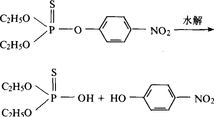 图2 对硝基苯酸的还原作用 水解作用 农药分子中的某一个官能团置换水分子中OH的反应。有机磷农药和氨基甲酸酯农药,受生物酶作用或受环境介质中酸碱度的影响,产生的水解作用,前者称生物水解,后者叫做化学水解。一般亲脂性的农药经水解后亲水性增强,从而可提高农药从生物体内排出或在环境中迁移的能力(图3)。