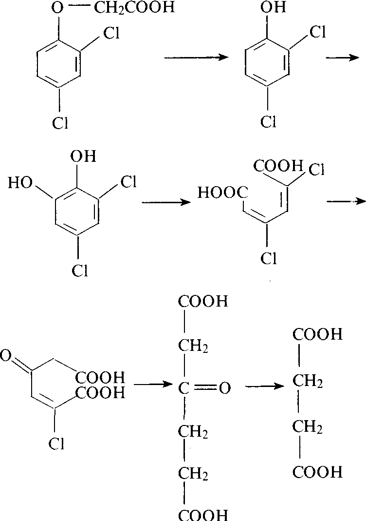 图3 乙基对硫磷的水解作用 土壤中的粘土矿物、腐殖质以及某些金属离子等均能促进农药的水解。区分生物水解和化学水解的方法是,将土壤先经灭菌与不灭菌处理后进行农药降解的比较试验。当后者的降解速率大于前者时,可认为农药在土壤中同时存在着生物水解和化学水解;当农药在两种处理中的降解速率相当时,则只有化学水解而不存在生物水解。(见农药水解作用)。 环开裂作用 环氧水化酶引起芳香族类化合物苯环开裂的反应,它是芳香族化合物生物代谢中的主要形式之一,环羧基化作用的位置受原有环上的取代基类型与位置和对其起代谢作用的微生物种的影响。 2,4-滴在生物代谢过程中苯环开裂的形式如图4。 影响条件 农药在土壤中的降解与农药的性质、剂型、使用方法,以及使用地区的气候和土壤条件有关。农药在高温多雨地区比在干寒地区容易降解,如滴滴涕