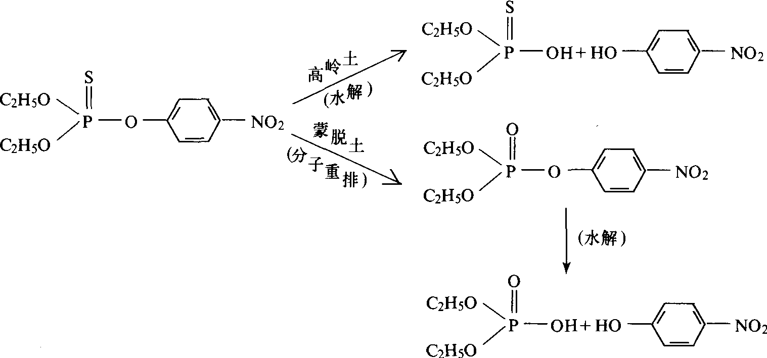 | 释义 | 农药水解作用hydrolysis of pesticides农药化合物RX与水分子H2O发生官能团X与OH的置换反应,其反应式如下: RX+H2O→ROH+HX 水解作用分生物水解与化学水解两大类。生物水解是在生物体内通过水解酶作用产生的反应,大多数亲脂性农药在生物体内经过水解后,转变成亲水性化合物,可提高其在水中的溶解度和从生物体内排出的能力;化学水解是在环境中由于酸碱的影响所引起的化学反应,化学水解属非生物降解中最普遍的反应之一,它对农药的加工贮存,以及对农药在环境中的稳定性与生物活性都有影响。 简史 农药在环境和生物体内的水解作用是农药降解的主要形式之一,1956年马利纳(M.A.Malina)最早报道了用粘土加工农药粉剂和可湿性粉剂时,吸附在粘土上的农药产生水解现象。这种吸附—催化水解反应,对有机磷类农药和均三氮苯类除草剂特别重要。1963年,欣德(E.Hinder)提出了马拉硫磷在土壤中的水解是在碱性条件下产生的碱解作用;1968年阿姆斯特朗(D.E.Armstrong)和切斯特斯(G.Chesters)对农药在土壤体系中的水解机理进行了研究,提出了莠去津除草剂的水解与土壤有机质中的羧基有关,而与酚基和蒙脱土等无关。 作用机理 农药在水中的水解速率主要受温度与酸碱度的影响,在土壤中还受到土壤粘土矿物、土壤腐殖质及金属离子催化作用的影响。其作用机理有如下几种。 吸附催化 土壤溶液中非金属矿物对农药水解的催化作用。各种粘土矿物对农药水解影响各异,高岭土能直接促进对硫磷的水解,而蒙脱土则要使对硫磷的分子重排(rearrangement)后,才能促进其水解作用(图1)。