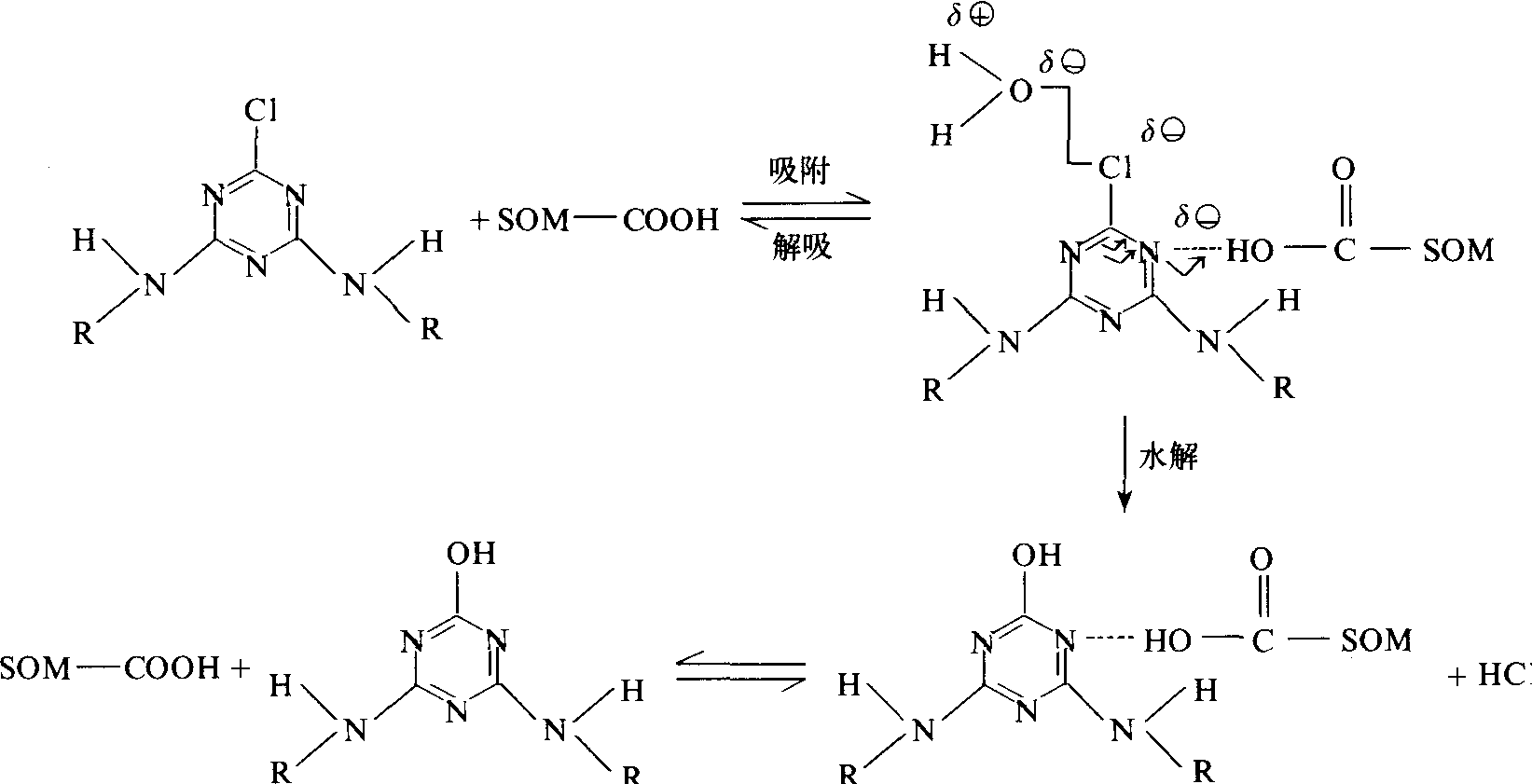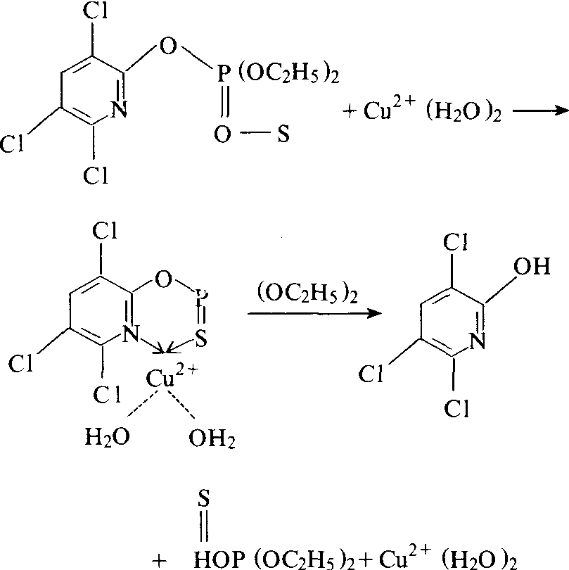 图2 Cu2+对毒死蜱(Dursban)农药配位催化水解 催化作用。Cu2+能促进多种有机磷农药的水解,其催化机理可能是农药分子与Cu2+形成配位结合后所起的作用(图2)。在渍水土壤中硫化亚铁和亚铁离子均能促进对硫磷农药的水解。 腐殖质催化 土壤腐殖质中—OH、—COOH等基团对农药的催化作用。莠去津在含0.5毫克/毫升的富非酸溶液中的水解半衰期为742天,在含5.0毫克/毫升的富非酸溶液中的水解半衰期为87.3天。莠去津除草剂在土壤中的吸附水解机理,被认为是发生在土壤腐殖质中被质子化(protonation)的羧基与莠去津环上的氮原子之间:因环上与氮原子结合的碳原子被负电性的氯和氮原子包围着,因而易受强亲核性试剂,如OH的影响而水解。在中性溶液中,弱亲核试剂H2O是不会取代氯原子的,但当H与环上的氮原子结合时,就会使缺电性的碳原子进一步引起电性降低,从而加速H2O取代Cl基团。莠去津除草剂的吸附水解模式如下: