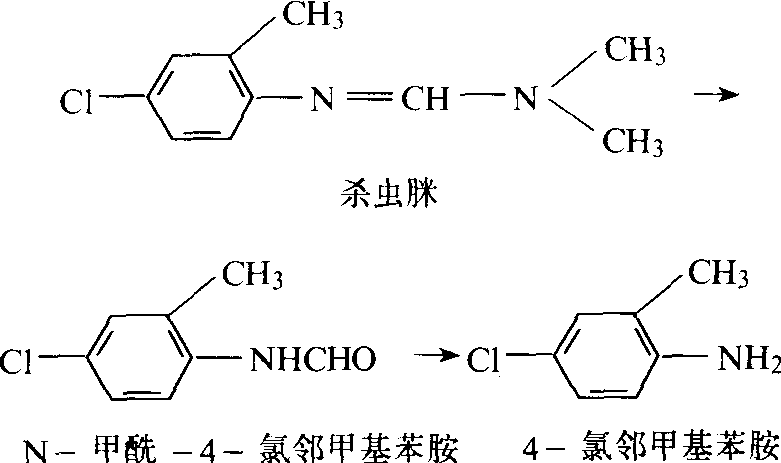 图2 杀虫脒的降解过程 农药在环境中残留期的长短,是农药性质、环境条件与施药方式三者共同作用的结果。农药的化学结构、分子大小、功能团类型及结合方式等都会影响农药在环境中的稳定性。如带有一个取代基的苯类化合物,土壤微生物对其降解的难易程度与取代基种类有关,降解所需时间依次为: