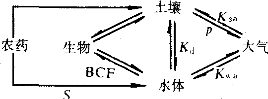 (据Martin Alexander and B.K.Lustigman,1966) 不同的农药品种,因化学性质的不同,在环境中的稳定性差异很大。汞制剂与砷制剂类农药,其有机态制剂降解后,仍以无机汞与无机砷状态存在于土壤中,它们在环境中只能通过形态转变与移动作用,从一处向另一处缓慢转移,因此,在土壤中的残留期很长,砷与汞均属有害元素,这两类农药多数已被淘汰。有机氯类农药,如艾氏剂、狄氏剂、滴滴涕、六六六等虽有较好的杀虫效果,但其残留期长,且易在生物体内富集,其大部分品种在许多国家已被禁用。有机磷类、氨基甲酸酯类与拟除虫菊酯类农药属低残留或中残留农药,残留期一般只有几天或数星期不等。 农药的降解与气候、土壤条件密切相关,通常在高温、多雨、有机质含量高、微生物活性强、偏碱性的土壤中容易降解。在初次施用农药地区,有些农药在土壤中的降解作用较慢,有一个滞后期。经过多次施药后,当土壤中的微生物适应了施药环境,体内形成可代谢农药的酶类以后,其降解速率可明显加快,这种现象称为富化作用。在美国种植马铃薯地区,因长期施用克百威,克百威在土壤中的残留期缩短,因而影响治虫效果。 施药方式和农药剂型对残留性的影响通常为:地面喷施、撒施,比在土壤中条施或穴施易于降解;颗粒剂在土壤中的残留期比粉剂或乳剂长;一次高剂量施用,比分次施用易于在土壤中残留,在高温多雨季节施用比在干寒季节使用易于降解。 残留农药通常是指用常规方法可检测到的、残留于环境或生物体内的农药及其有毒的降解产物。然而有部分农药进入环境与生物体内后,与其所在介质中的某些物质紧密结合为结合残留,在环境中残留期更长。结合残留农药不能用常规方法测定,只能用同位素方法才能检测出来。在一般情况下,结合残留农药已失去了生物活性与毒性,但在一定条件下可再度释放出来,因此不能忽视其对环境的潜在影响。(见农药残留) 移动与扩散 农药从防治对象或防治地区向周围环境扩散的物理行为。施用农药一般都有明确的防治对象与特定的区域,然而农药进入环境后,将不断地从施药区向四周扩散,从而导致对附近水体、大气及生物的污染与危害,一些持久性很强的农药,如滴滴涕甚至会影响全球环境。影响农药移动的因子主要取决于农药的理化性质与环境条件,两者具有相互制约的分配平衡关系(图3)。