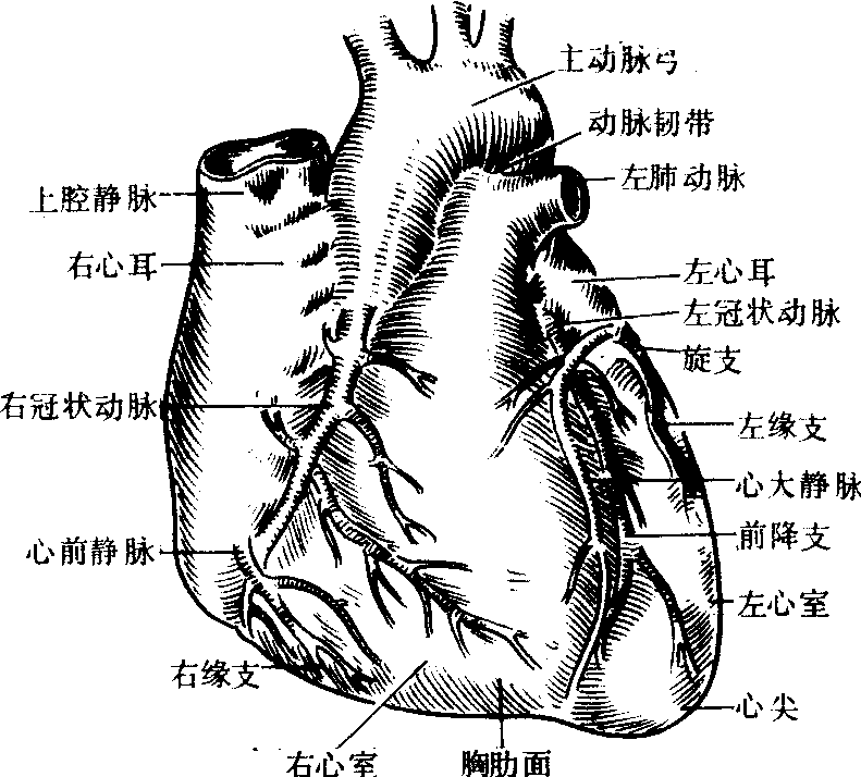 | 释义 | 冠状循环guanzhuang xunhuan属大循环,为供应心脏血液的循环。由冠状动脉、毛细血管和冠状静脉组成。血液由主动脉基部发出的左右冠状动脉分支,经毛细血管、冠状静脉,最后流回右心房。冠状循环主要是供给心肌氧气和营养物质,带走其代谢产物。心脏经常处于持续的舒、缩状态,工作量很大,而且心肌细胞必须在有氧气的情况下才能供能,耗氧量很大,因而需要有充足的氧气和营养物质供给心肌细胞,这主要来源于充足的血液供应。正常情况下,进入冠状循环的血量占心输出量的8~9%。如果冠状动脉因病变阻塞,影响了心肌的血液供应,心脏就不能工作,而出现心肌梗塞、心绞痛等疾病。 冠状循环血液从左心室射出到主动脉,继后流入心脏左、右冠状动脉和毛细血管网,进入冠状静脉,经其窦口流入右心房的过程。安静状况下,正常成人心肌每分钟接受约200毫升血液,占心输出量3—4%,同时获取氧气。 冠状循环指维持心脏血液循环的血管。包括动脉、静脉和毛细血管。冠状动脉分左右两支,起始于主动脉根部,行走于心脏表面并逐渐分支,以垂直于心脏表面的方向伸入到心肌组织中。小分支一般分为两类,一类很快分为许多细支,分布于心肌层的外3/4~4/5;另一类数目很少,垂直穿入心肌层,并达心内膜下形成血管丛,以营养心肌层的内1/4~1/5。毛细血管分别汇集成小静脉,其中少部分静脉经心前静脉进入右心房或直接开口于心脏各腔;绝大部分静脉汇入冠状窦而流回右心房。因此,冠状窦的血量可代表冠状循环的回心血量变化。在冠状动脉的分支有前降支、左旋支,主要营养左心室前壁(胸肋面)和侧壁;右冠状动脉的分支有窦房结动脉、圆锥动脉、房室结动脉及后降支,主要营养右心室和右心室后壁(膈面)。右冠状动脉和血流量较大,当其阻塞时,受害区较大,后果较严重。心肌内毛细血管丰富,其排列与心肌纤维相平行。成人毛细血管与心肌纤维数之比约为1:1。当心肌发生代偿性肥大时,毛细血管数量不能相应增加,故肥大的心脏易缺氧。冠状动脉之间有侧支互相吻合,较大分支之间吻合支较少,而较细动脉之间吻合支较多。因此,当较大分支阻塞时,常导致心肌梗塞。如果冠脉阻塞是缓慢形成的,而且梗塞面积较小,其侧支可逐渐扩张,并建立新的侧支循环,以起代偿作用。