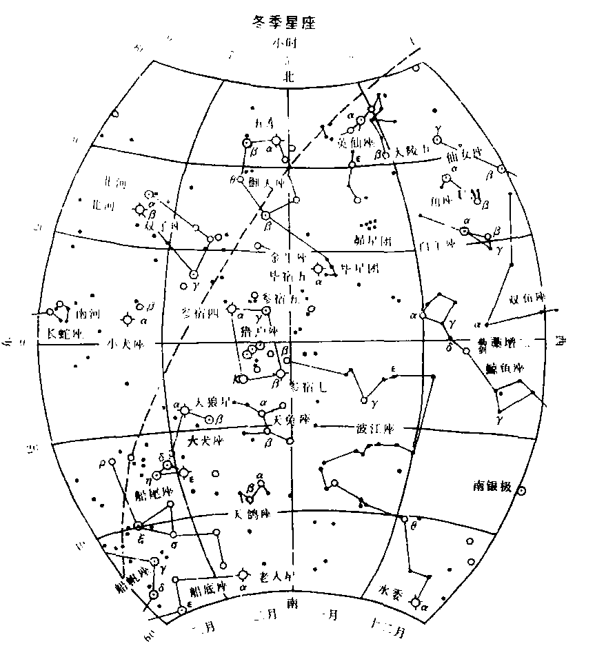 | 释义 | 冬季星空Dong ji xing kong冬季星空的主要星座是金牛座、猎户座、大犬座、小犬座、双子座、御夫座、波江座等。冬季的北斗七星在天空的东北方,“斗柄”朝下。猎户座是天赤道附近的主要星座之一。在全天88个星座中,猎户座的亮星最多,主星α是一颗有名的红色超巨星,星等变化在0.4等到1等之间,我国古代称它为“参宿四”,另一颗亮星β,呈青白色的○等超巨星,古代称之为“参宿七”,α、β与另外五颗2等星合称“参宿七星”,其中α、γ、β、κ四颗组成一个大四边形,另外三颗即参宿一、二、三在四边形中间,位于天赤道附近,在猎户座的中央,是著名的“猎户三星”,我国又称为“参宿三星”。猎户三星位北半球冬季黄昏星空的中心,也是主要部位。猎户座是古希腊神话中的狩猎巨人奥利安,猎户座α星和γ星是猎人的两肩,β星和K星是猎人的脚脖子和膝盖。中央的参宿三星是猎人的腰带。这下面还有三颗小星是挂在腰带上的剑。小三星周围的青白色朦胧云是有名的猎户座大星云,是肉眼隐约可见的明亮的气体星云。沿猎户三星向东南方向延长约七倍长度有一颗亮星,这就是大犬座α星,中名是天狼星,它是一颗颜色发白,光亮夺目的星,亮度为-1.45等,它是全天最亮的恒星,冬日落后它从东方升起在南方天空,天狼星周围有四颗2等星,形成大犬的前足和后足。大犬座有亮于4等的星18颗。金牛座是黄道十二星座之一,它有两个星团分别是毕星团和昴星团,位于金牛座的中心。金牛座α星在毕星团“V”字形的开口末端,呈橙色的1等星,中名为“毕宿五”,被古希腊人想象成金牛的眼睛,是一颗低温巨星,距离我们约65光年,直径为太阳的47倍。在毕宿五附近的V形毕星团,实际上是由三、四百颗恒星组成的,毕宿五虽在毕星团附近,但不属毕星团成员,只是毕星团的前景星。毕星团右上方是六、七颗聚在一起闪闪发光的昴星团,又称“七姐妹”星团,也是全天空中美丽的星团之一,昴星团的群星约有130颗以上的恒星及包围着恒星的气体云,发出青白色的光彩。金牛座内有亮于4等的星28颗。在猎户座东面是小犬座、小犬座α星,中名“南河三”,是颗闪闪发光的1等星,它与猎户座的α星参宿四,大犬座α星天狼星组成了又一个等边三角形,称为“冬季大三角形”。另外与猎户座隔银河相对的是双子座,它的几颗亮星组成一个长方形。天顶附近的御夫座组成扁平的五角形。在猎户座右下方是波江座,弯弯曲曲向南拖得很长,北始于猎户座β星参宿七,然后弯曲向西再向南弯曲到南地平线,全长达130°。