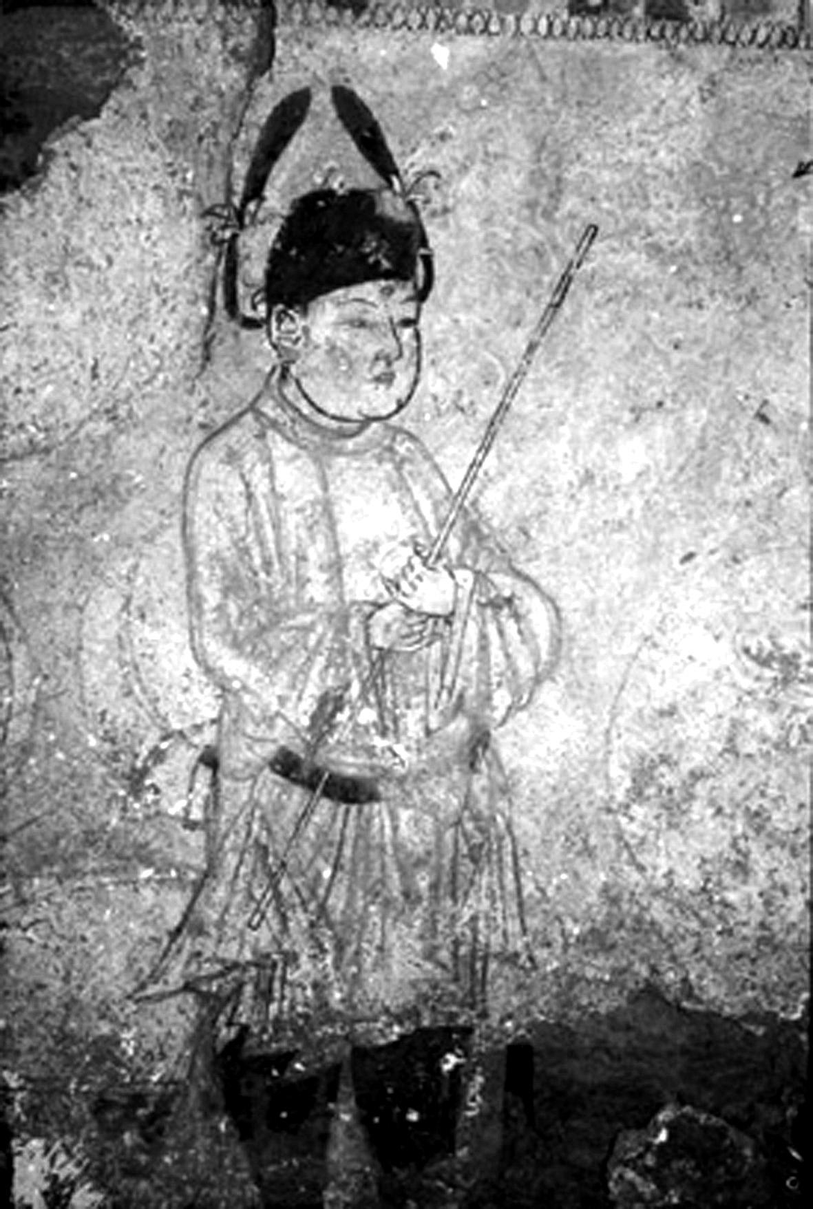 | 释义 | 冯晖墓壁画fenghui mu bihua1992年彬县底店乡前家嘴村五代冯晖墓发现。墓壁均有壁画。可分甬道、墓室、侧室三个单元。甬道部分用粉红色作底,间隔以淡黄色团花,甬道尽头(北端)分别为两个持杖人物,东壁人物为男性,侧身向里(北),头戴硬脚幞头,络腮胡,身着紫红色圆领袍服,双手执杖胸前,脚着黑色高靿靴。西壁人物为女性,亦侧身向里,头戴幞头,额饰红点,耳挂红色耳坠。身着浅红色圆领短袍,脚着黑色高靿靴,双手执杖胸前。男持杖者与甬道东壁彩绘砖雕组成一个男乐舞队。女持杖者与甬道西壁彩绘砖雕组成一个女乐舞队。人物之上为垂帐一道,底部饰联珠。直壁与弧顶交接的突棱上为团花带;弧底顶部为倒S形半团花花带;其上为等距离之红黄色太阳花一道。东西两壁对称,穹顶遍施大朵缠枝牡丹。墓室穹顶为彩底白色星相银河、月桂图,下部脱落严重;直壁部分壁画背景全以赭色衬底,白底淡黄色团花牡丹相间。团花之间填以淡黄色牡丹。周壁绘六侍女,分别执拂尘、团蒲、净瓶、唾盂、长巾(一个脱落)。其中东壁东侧室左侧侍女侧身向右。侍女头梳双环髻,髻上扎粉红色锦带,面容丰满,额饰红点,耳戴红色耳坠。身着红底黄团花对襟宽袖女袍,内着红色抹胸,红色长裙;上套圆边围裙,脚着尖履。左臂搭花叶纹白色长巾。右侧为一侍女双手捧盂侍立,服饰基本相同,内着黄色抹胸,淡黄色曳地长裙;西壁左侧为女子侍立图,残缺不全。右侧为一侍女怀抱蒲团侍立,容貌服饰与东壁右侧侍女相同;墓室北壁左侧为一女子手执净瓶向右侧侍立。头部缺,身着淡红色对襟窄袖女袍;内着淡红色抹胸,白色曳地长裙;脚着尖履。右侧侍女手持拂尘,身穿黄色碎花对襟窄袖女袍,内着抹胸,红黄色曳地长裙,脚着尖履,头部缺。南壁壁画严重脱落,从残留部分可以看出两侧面均有幔帐,其下有案,案上置放成串的铜钱及红、黄、蓝、白等成匹绢布、带托的注子、杯、盘等,盘内放红色、白色水果等;侧室壁画脱落严重,残存有蔓草、睡莲花、牵牛花、牡丹、凤凰等图案。冯晖墓壁画及砖雕反映了墓主生前的庄园家居和乐舞生活。现藏彬县文化馆。