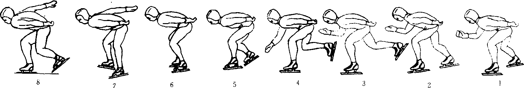 教学重点 ❶单脚蹬冰时重心要确保移向支撑脚,支撑脚的踝关节要随之前屈,以防重心没有落到支撑脚上反而使支撑脚向前滑走。 ❷开始练习时蹬冰幅度要小一些,蹬冰要短促,收腿要快,双脚滑行要长一些。滑行中重心位于脚掌或脚心,防止臀部后坐。 ❸交替蹬冰交替滑行移动重心时, 应准确地落在支撑腿上(头、膝、足尖在一垂线上),浮脚着冰时不能向前或向侧迈出。 ❹做重心先放在支撑脚上的单蹬双滑练习,再做滑行中的单蹬双滑练习。在单蹬双滑练习中,逐渐减少双脚滑行的距离,最后过渡到交替蹬冰交替滑行。 ❺交替蹬冰交替滑行经过练习后, 应逐渐加长单脚支撑滑行的距离和时间,提高单脚支撑能力,再降低蹲姿和改变收腿动作, 即可变为速滑直道技术。 |
