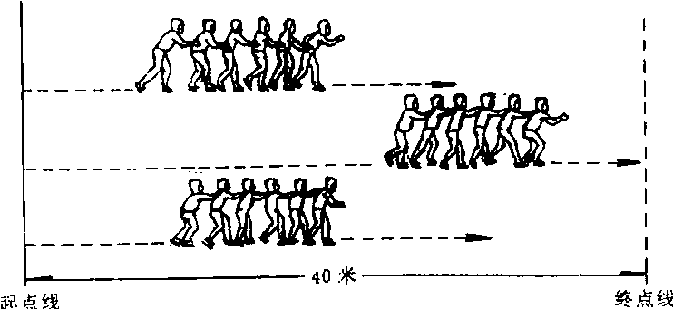 适用于4—6年级。可以增强冰上站立能力, 提高学生的兴奋性。器材 冰鞋若干双。场地 在滑冰场内划两条相距30—40米的平行线。一条为起点, 另一条为终点。游戏方法 把学生分成人数相等的若干组, 每组