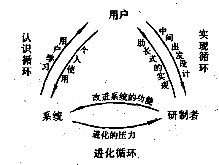 研制方法 应用交互设计原理研制决策支持系统,其交互设计过程如图所示。认识循环表示用户和系统的相互作用,实现循环表示研制者与用户关系,进化循环反映研制者实现系统的方法和途径。