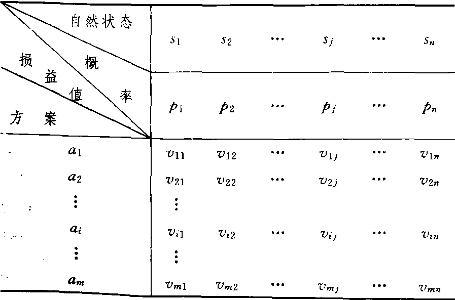 pj=1;vij为方案ai在自然状态sj下所产生的收益值(+)或亏损值(-)。利用损益矩阵可以计算各个方案的损益期望值,公式如下: