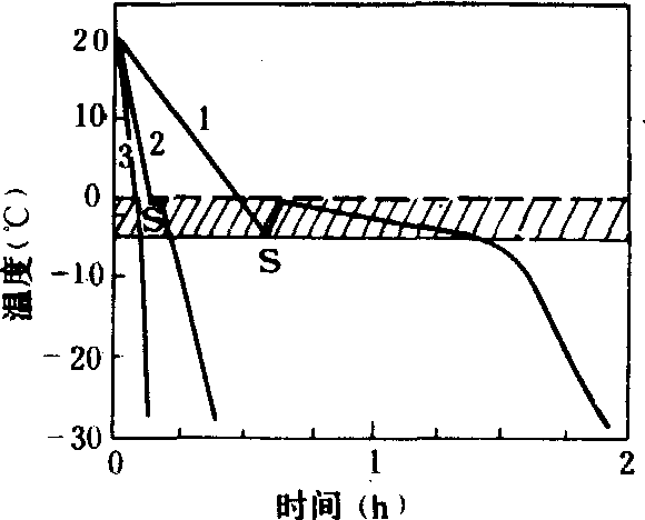 图 1 速冻与缓冻的冻结曲线S. 过冷却点; 1. 缓冻; 2、3. 速冻;阴影为最大冰晶体形成带 速冻时, 果品降温迅速, 结冰速度快, 通过最大冰晶体形成温度带的时间短, 过冷现象不明显, 冻结受伤小;果品内部由于起晶速度快, 冰晶体数量多,体积小,细胞间隙不致于严重扩张, 原生质紧贴细胞壁,壁与膜破损不大, 对果品组织质地影响较少, 解冻后的产品能接近于新鲜果品的质地, 且细胞液不致于大量流出, 流汁轻。 果品速冻和贮藏期间仍有少量的化学反应进行,故而有可能产生不良风味; 还可能由于果胶酶的作用使果肉质地变软, 多酚氧化酶的作用而出现酶褐变现象; 叶绿素变成脱镁叶绿素,使绿色果品色泽变褐;果品的维生素C及其他维生素含量视包装的不同均会不同程度地损失,速冻后,由于某些缓冲物质的凝固, 果品的酸味增加。 工艺过程 包括原料的选择和处理、包装、冻结、冻藏、解冻等。 原料的选择和处理 包括原料品种和成熟度的选择、果品质量的挑选、分级、清洗等。用于速冻的果品必须品种合适、充分成熟、清洁完好。 冻结前剔除不合格果,进行适当的分级、清洗、除去杂质, 某些水果需经特殊处理以除去污染物质。有核或心的果实要去核去心, 大型果要适当切分。酶褐变严重的需进行烫漂并采用其他方法护色。质软的果肉适当硬化。 包装 除单果速冻(又称单体速冻)外, 冻前需行包装, 以防止冻结时水分的损失, 减轻冷冻设备结霜和产品的氧化变质, 同时便于销售等。根据产品的性质和用途在包装时常加糖浆或干糖及抗坏血酸, 以增加风味, 保留较好的芳香物质和色泽, 减少低温下水的冻结量, 减轻氧化变质。包装材料常有纸质、金属复合罐、聚乙烯和聚丙烯薄膜袋、金属罐等, 再加工用原料也有用木桶包装的。