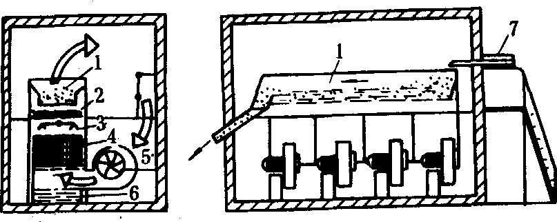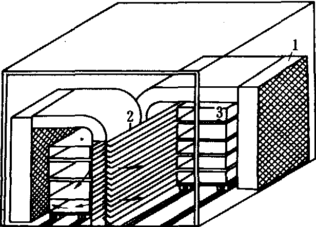 图 2 隧道式鼓风速冻装置1. 绝热层; 2. 制冷剂蒸发管; 3. 手推车 冻结 依所用装置和果品种类、品种而异。依制冷剂与果品接触的状况可有: ❶冷空气冷冻。用被制冷剂冷却的冷空气作为热量传递的介质, 产品在这种冷介质里一段时间后即被冻结。传统的方法为冷库内静止冷空气冷冻, 时间长, 质量差, 果品加工上仅用于大容器或桶装的加工用原料。鼓风冷冻为静空气冷冻的改进方法, 特点是冷空气高速流动, 冻结所需时间短, 适用于绝大多数果品, 一般设备内温度-29~-46℃,风速每分钟10~15米。装置有分批间歇性冻结的小室,用输送带或小车进行连续冻结的隧道(图2),直立向上的回旋输送带式装置及流床化单体速冻装置(图3)等。其中隧道式冻结装置在果品速冻中应用最广, 可以连续生产。流床化装置适合于草莓等小型果及切丁的桃、菠萝和切片的水果。 ❷间接接触冷冻。制冷剂与产品不直接接触, 常用设备为平板冷冻机, 包装的产品放于2块可上下移动的平板之间, 制冷剂在平板内回流, 产品依与平板接触而降温冻结, 适用于包装好的产品。 ❸直接接触冷冻。果品与空气以外的制冷介质直接接触而冻结,有浸渍法和喷淋法两种。普通用于浸渍的制冷介质有食盐(23%水溶液可降温至-21.1℃)=、蔗糖(62%水溶液可降温至-21℃)、甘油(67%水溶液可降温至-46.7℃)、丙二醇(60%水溶液可降温至-51℃而不结冰); 用于喷淋的常为深低温制冷剂, 如液氮(沸点-195.8℃)、二氧化碳(沸点-78.5℃)。直接接触冷冻法适合于单果速冻或小包装的水果。 ❹液化气体冷冻法。喷淋的深低温制冷剂不直接接触产品, 而是气化后的低温气体与产品接触而冻结,一般装置为喷淋液氮,温度可达-80~-100℃,适合于一些名贵的水果。