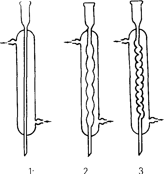 | 释义 | 冷凝管lengningguan将蒸气冷凝成液体的仪器,为硬质玻璃制品,由内管和外部套管组成。内管通蒸气,有直形、球形和蛇形3种; 外管通冷凝水,有进水口和出水口,构造见图。直形冷凝管冷却面积较小,但冷凝后的液体很少残留在内管中,多用于蒸馏装置中; 球形冷凝管的冷却面积较大,常用于一般回流装置中; 蛇形冷凝管的冷却面积大,效率高,用于低沸点和有毒液体的回流。在蒸馏装置中一般不用球形冷凝管,也不能用蛇形冷凝管,否则内管中会残存一定量的馏出液,影响不同组分的分离,降低产物的纯度。进行冷凝操作时,应先通冷凝水,然后再使液体受热气化,否则会使蒸气逸出或炸裂冷凝管。冷凝水要从低处流向高处,与气流方向相反,否则冷凝效果不好。冷凝操作完毕时,应先停止加热再关冷凝水。冷凝过程中不可断水。
