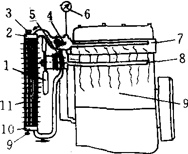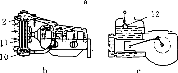 水冷却系简图 a. 压力循环式 b. 自然循环式 c. 蒸发式 1.风扇 2.上水箱 3.空气—蒸气阀 4. 节温器 5.水泵 6.水温表 7. 水套 8.分水管 9.放水阀 10.下水箱 11. 散热器 12. 浮子 |