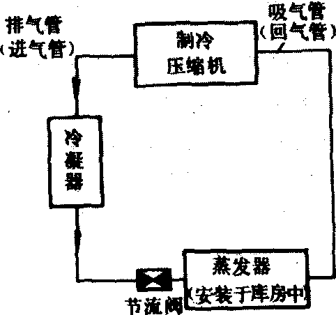 机械制冷原理 制冷系统 库体只是对果蔬产品贮藏提供了一个隔热场所,在大多数情况下还需外界提供冷源,以达到低温冷藏的目的。制冷系统的工作过程(见图)是:在一个封闭的系统中,压缩机将吸气管中低压低温气态的制冷剂吸入进行压缩,使制冷剂成为高温高压状态的气体,然后由排气管排出,经过冷凝器时制冷剂放出热量进行降温而成为液态。然后由管路经过节流阀,使制冷剂压力下降为低压,进入蒸发器中,同时蒸发吸热,从而使冷藏库中的空气、货物被冷却。制冷剂在蒸发器中蒸发后,成为低压低温状态的气体,又被压缩机吸入机腔中压缩,形成循环。主要设备有:❶压缩机组。根据使用的制冷剂不同,可分为氨(NH3)压缩机组、氟-12压缩机组和氟-22压缩机组。按照压缩机结构形式的不同,又可分为离心式、活塞式和螺杆式压缩机组。 ❷冷凝器。是用冷却介质与从压缩机中出来的高温高压气态制冷剂进行热交换的装置。通常冷凝器均采用水作为换热介质,也有采用空气作为冷却介质的。 ❸附属设备。常规冷藏库的附属设备主要有通风换气系统、循环冷却水系统和照明电气系统。此外,还需其他配套设备,包括节流阀、油分离器、贮液器和紧急泄氨器等。 |