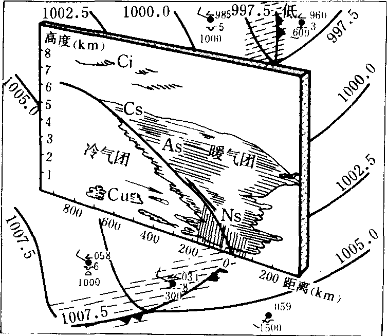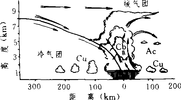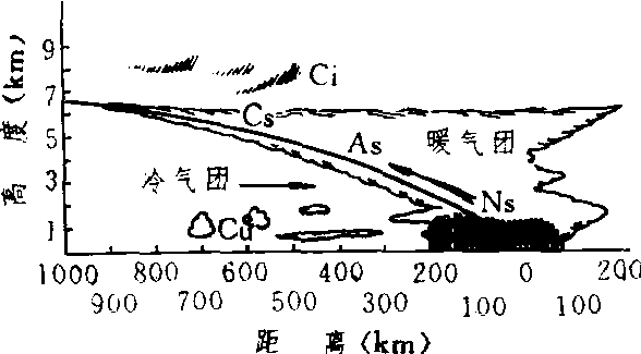 图2 第二型冷锋 Ci卷云 Cs卷层云 Ac高积云 As高层云 Cu积云 Ns雨层云 Cb积雨云 |