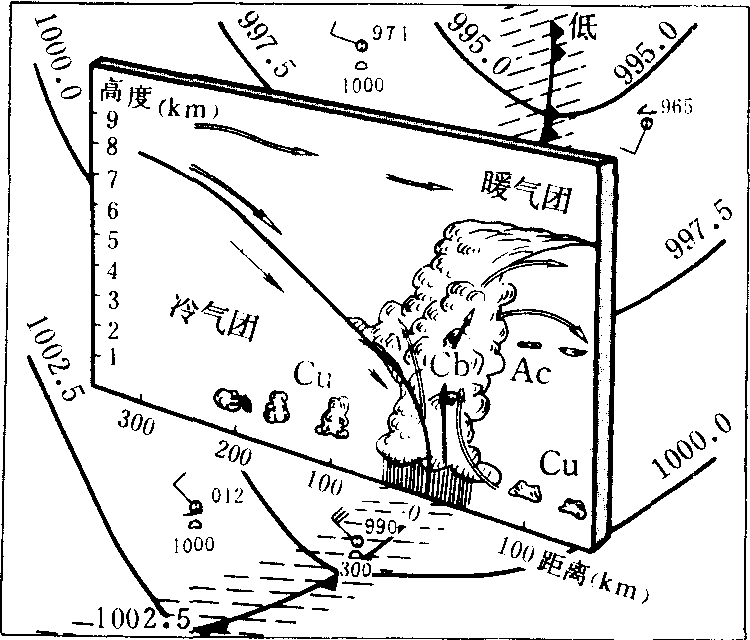 图 2 第二型冷锋 说明: 图内大方格为地面天气图, 图内小方格为垂直于地面锋线的垂直剖面图。 冷锋向暖气团一侧移动的锋。移动慢的称“第一型冷锋”,移动快的称“第二型冷锋”。两者天气有明显差异。前者过境时,常出现连续性降水,有时伴有大风。后者过境时,夏季常出现强烈阵雨、雷雨、大风,一般持续时间短,锋线一过,天气即转好;冬季有时有稳定性降水,有时只有大风,无降水,这种锋又称“干冷锋”。冷锋过境,气温常下降。 冷锋cold front从冷气团地区向暖气团地区移动的锋。按移动快慢和锋面上垂直运动等特点常分为第1型冷锋和第2型冷锋。第1型冷锋移动缓慢,也称缓行冷锋。锋面坡度约1/100。冷锋在中国的移动方向多为自北向南和自西向东。由于冷空气在下方挤抬,使暖空气沿锋面向上滑升,在锋面上方形成云带,并可出现稳定性降水。降水带常在地面锋线的后方,即冷空气一侧,降水带宽约150~200 km。若锋前暖气团不稳定,则在锋线附近有积雨云和雷阵雨发生,是中国夏季常见的一种降水型式(图1)。第2型冷锋移动快速,也称快行冷锋。锋面坡度约1/70,接近地面层的锋面更陡,近于垂直,甚至向前凸出成“冷空气鼻子”而冲击暖空气使之发生猛烈上升运动,在地面锋线两侧的狭窄地带形成云(积雨云)和降水,常伴有阵雨、雷暴、冰雹、大风等猛烈天气,春夏季节尤为常见(图2)。