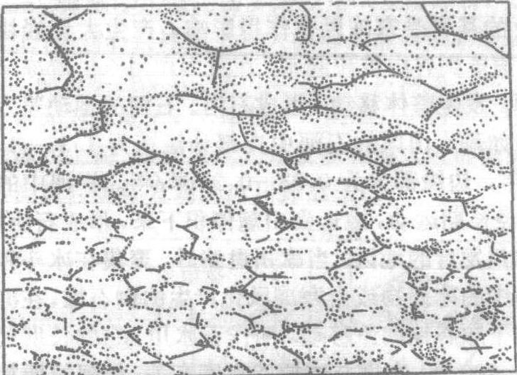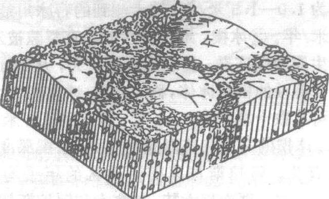 ❸冰楔:地表泥沙的垂直裂隙被水充填,并发生周期性冻融,使裂隙不断扩大,从剖面看,是一个含泥沙的楔状冰体,称为冰楔。冰楔的大小不一,宽度可从数十厘米到7—8米,深度可从1米至30—40米。冰楔的宽度和冻融频度有关,冰楔深度和寒冷程度有关。阿拉斯加冰楔活动区的年平均温度为-6°—-8℃。据南极大陆、加拿大和阿拉斯加等地观测,冰楔的增长率大约为1毫米/年。和冰楔的情况相似,但裂隙中充填的不是冰,而是松散的砂土,称为砂楔。砂楔可从冰楔演变而来,当冰楔内的冰融化后,砂土充填楔内,成为砂楔;砂楔也可能是地表冻裂之后,直接由砂土充填其内而形成。砂楔是寒冷气候的产物,是古气候的重要标志,在我国东北北部和青藏高原的剖面中常可见到,最近几年先后在北纬40°左右的大同盆地和阳原盆地也发现晚更新世晚期的砂楔。如图1、图2所示,冰楔、砂楔在地表平面上呈多边形,故称为多边形构造土。