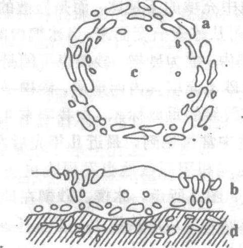 ❹石环:在极地、亚极地及高山地区的地表面常出现一种中心为细粒土,周围由较粗大的砾石组成的圆环状地貌形态,称为石环(图3、4)。石环的直径一般为0.5—2米,在极地可达10余米。如果地表上每个石环彼此相连,就组成石多边形,许多石多边形结合在一起,组成多边形网状土。石环的形成原因是:在冻土层的上层活层内,饱含水分的沉积物,经频繁的冻融交替作用,发生的物质分异过程的结果。垂直方向上的分异作用使土层中的粗粒物质集中到地表,水平方向上的分异作用使粗粒由圆中心移到周围(详见杨景春主编地貌学教程第128—130页)。石环一般形成在有一定比例细土地区,并且土中含有充足的水分,所以在河漫滩或洪积扇边缘常见石环发育。石环形成的速度较快。在祁连山某冰川边缘,冰川退缩不到两年,冰碛物中就发育有大量的石环,其直径可达4—5米。斜坡上的石环,在重力作用下常呈椭圆形,它的前端由大石块构成石堤,这种石环又称石圈。在较陡的山坡上,石圈前端常分开,在冻融分选作用下,使大块砾石集中分布在纵长延伸的裂隙中,呈带状分布,称为石带。