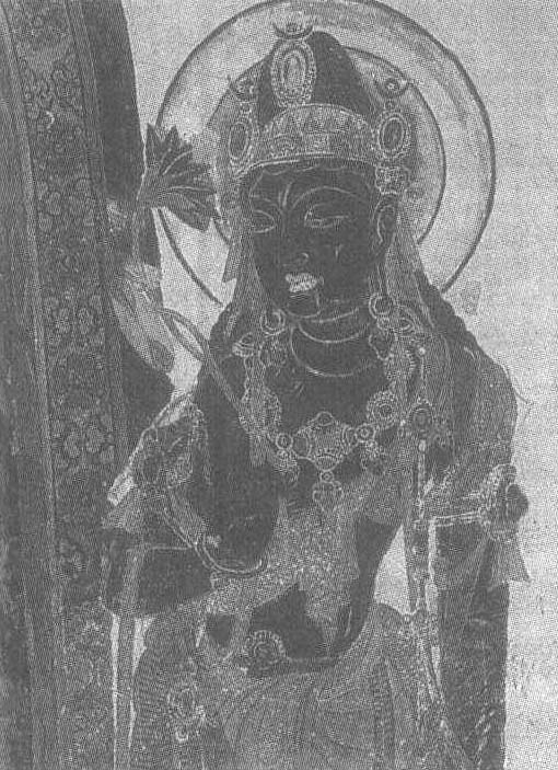 | 释义 | 准提观音像壁画盛唐。甘肃省敦煌县莫高窟第217窟西壁北侧壁画。准提观音为大观音之一。“准提”意为“清净”,意思是心性洁净。晚期形象为三目十八臂,在盛唐壁画中,她的形象较为少见。此尊准提菩萨头戴有化佛的宝冠,面形丰圆,眉长而弯,美目微垂,额心另有一眉,鼻子小巧,唇厚润。璎珞、臂钏精美,服装华丽,花纹绘画细致,衣裙飘洒具有质感。站姿为S形,充分展示了女性的柔媚。左手轻握净瓶,右手拈荷花一枝,手姿十分优美。其形象富有女性魅力。因年代久远,大部分设色严重变色,只有青绿鲜艳如初。