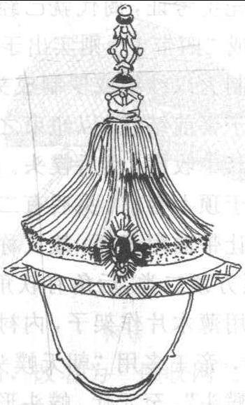 凉帽 凉帽清代满族男子夏季礼帽。立夏前戴之。无檐、形如覆釜,作 “△”形,俗称“喇叭式”。初尚扁而大,后尚高而小。分白罗胎(藤丝)、万丝胎 (竹丝) 两种,外裱以绫罗,初热用白或湖色罗,极热用黄色纱。白罗胎者,穿单、纱袍褂时戴用; 万丝胎者,仅于穿亮纱、葛纱袍时戴之。帽顶缀红缨,品官装顶珠。五品以下官员用红里,青蓝倭缎缘边,无官者用别色。有丧3年者戴羽缨(一作 “雨缨”) 帽,形式同上,藤为质,上缀黑缨,惟无缘。丧期品官不得用顶戴。行装之凉帽,亦藤为之,缨以红色犛牛毛,其最佳者曰“铁杆缨”。