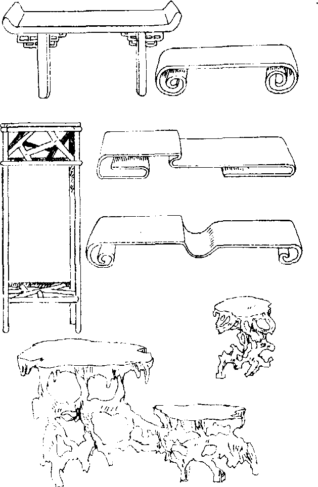 几架 几架的取材有红木、花梨木、紫檀木、枣木、黄杨、香红木、柚木、楠木、鸡翅木等。其中以紫檀木为佳,其木质细腻坚硬,色泽紫亮光洁。也有用枯树根制成的天然形树根几。 几架配盆也有一定的规律,一般情况下长方盆和椭圆盆配两搁几或四搁几,或书卷几;长方盆配长方几;圆盆配鼓凳几和圆几;深方盆和圆盆配高脚几;树根几一般呈圆形,所以配圆形盆居多;高的配深盆,矮的配浅盆;双连几配两盆形型相称的盆景;博古架、十景架、多宝架用于陈列小型、微型盆景;大型桌类,主要陈放大型盆景,或承托书卷几等矮小几座。几座根据盆型决定,一般要几座略大于盆底。 |
